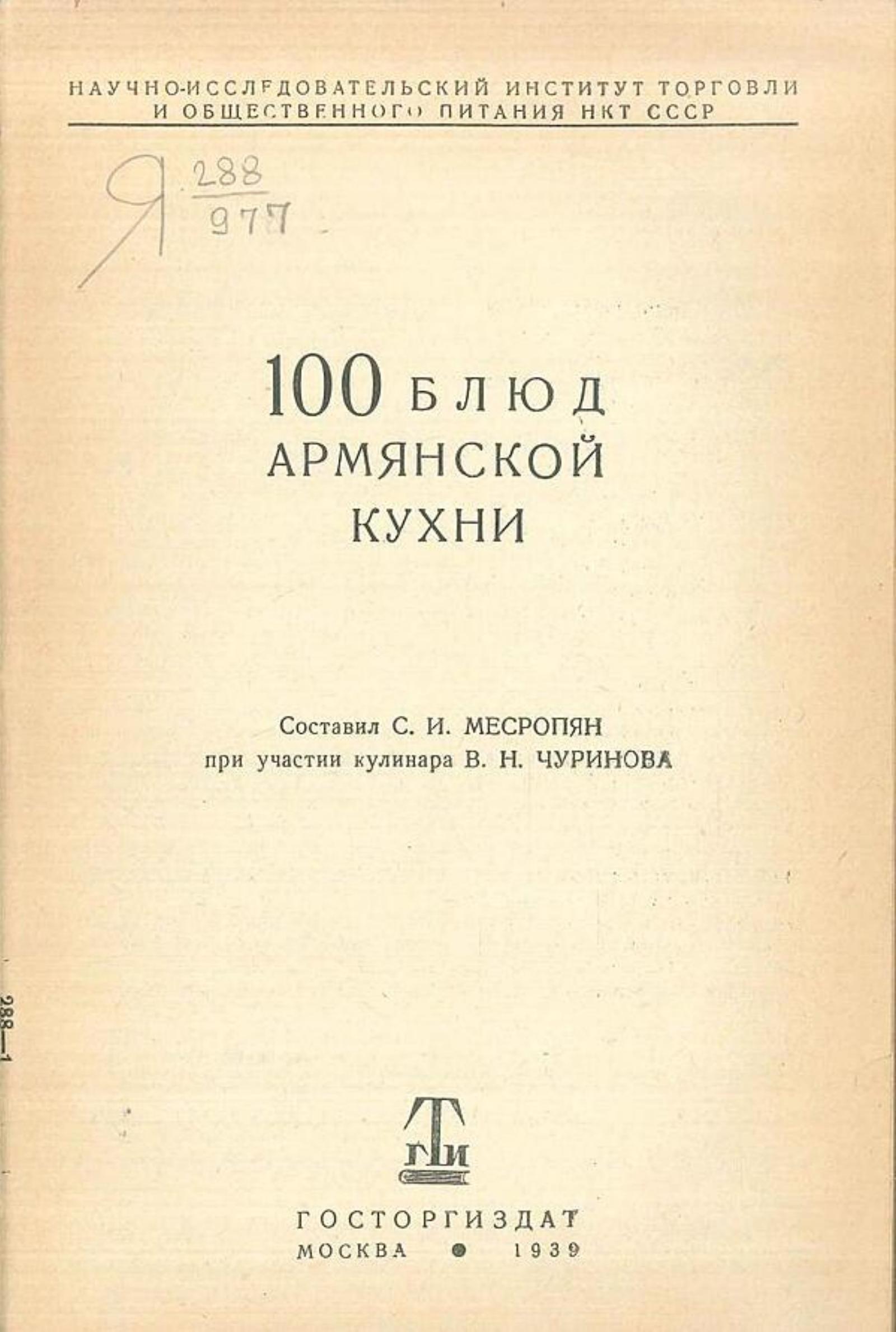 Месропян, Сурен Иосифович. 100 блюд армянской кухни / Сост. С. И. Месропян; при участии кулинара В. Н. Чуринова; Н.-и. ин-т торговли и обществ. питания НКТ СССР. — Москва : Госторгиздат, 1939. — 56 с.; 22 см.