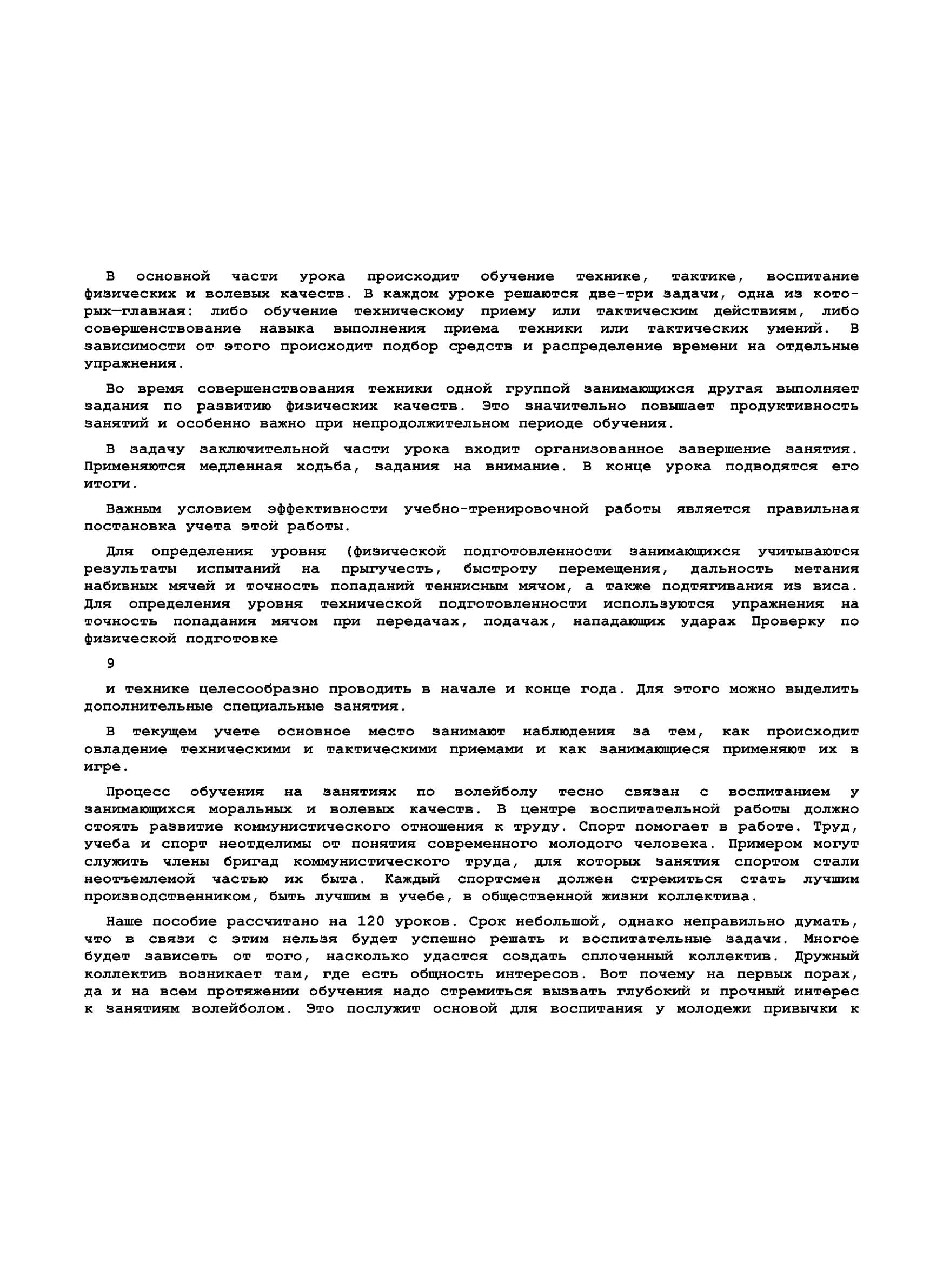 Настоящее учебное пособие не рассчитано на многолетнюю учебно-тренировочную работу. Оно ставит своей задачей дать начальный курс обучения волейболу и помочь общественному физкультурному активу в массовой подготовке волейболистов. Поэтому мы здесь подробно не рассматриваем вопросы планирования. Однако основные положения планирования учтены при поурочном изложении учебного материала. Учтены также закономерности формирования двигательных навыков, специфика волейбола, содержание и методика физической подготовки, обучения технике и тактике, соотношение средств физической, технической и тактической подготовки, периодизация учебно-тренировочного процесса и т. д. Курс обучения рассчитан на 120 уроков, количество занятий в неделю три, продолжительность одного занятия 120 мин. Это соответствует одному учебному году работы в спортивной секции коллектива физкультуры.Учителям и студентам можно использовать как готовые конспекты уроков.