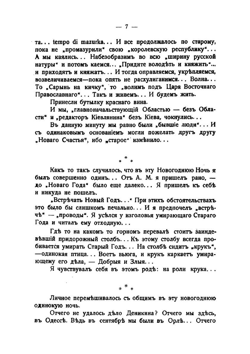 Воспоминания Шульгина мало того, что написаны хорошо, но и объективны. Шульгин, человек далеко не левых убеждений, не оправдывает белых только за то, что они не красные, и честно пишет, что видел, за что в эмиграции был многими нелюбим. А мы его любим за правду и силу письма.От автора: "Безполезно, конечно, напоминать, что мы живем в эпоху, которой будут весьма интересоваться наши потомки. Но может быть следует подумать о том, что о Русской Революциии будет написано столько же лжи, сколько о Французской. Из этой лжи вытечет опять какая-нибудь новая беда. Для нас это ясно. Мы, современники Русской Революции (начавшейся в 1917 году), прекрасно знаем, какую роль в этом несчастьи сыграло лживое изображение Революции Французской. Поэтому в высшей степени важно для нашего будущего правдивое изображение того, что сейчас происходит перед нашими глазами.Разумеется, время для изображения нашей трагедии во всем ее объеме, так сказать с журавлиной высоты, еще не наступило. Невозможно, с другой стороны, пока и интимное изображение нашей жизни, т.е. как мы любили, ненавидели, страдали и радовались — ключ, без которого, конечно, будущие историки ничего не поймут. Или поймут вкривь и вкось, как это они всегда и делают. Но можно и должно записывать то, что каждый из нас видел воочию. Настоящий очерк и представляет опыт записать "кусочки жизни", пробежавшие перед моими глазами. Я выбрал 1920 год, как ближайший."