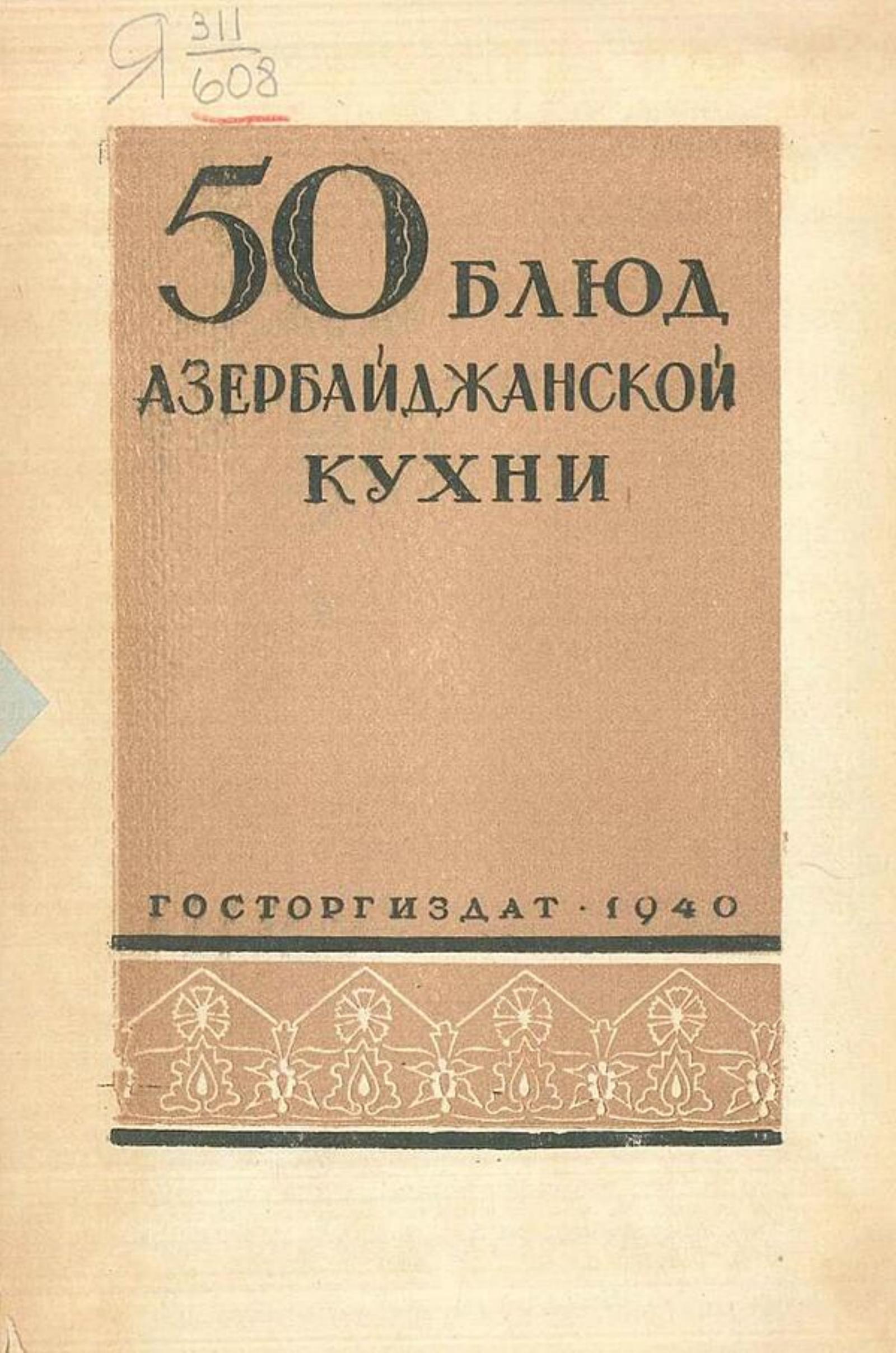 Месропян, Сурен Иосифович. 50 блюд азербайджанской кухни / Сост. С. И. Месропян и В. И. Схиртладзе при участии В. Н. Чуринова; Н.-и. ин-т торговли и обществ. питания НКТ СССР. — Москва : Госторгиздат, 1940. — 44 с.; 22 см.
