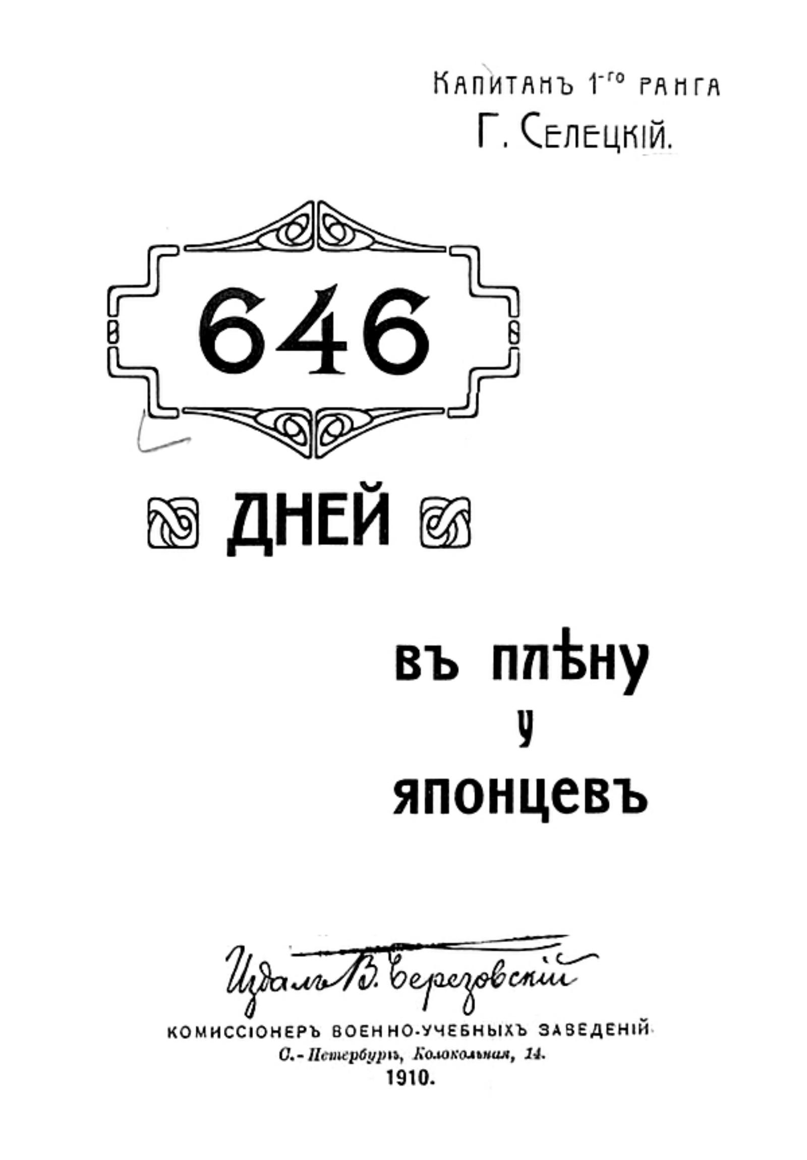 Селецкий, Георгий Гаврилович (1858–?). 646 дней в плену у японцев / Г. Г. Селецкий. — Санкт-Петербург : В. Березовский, 1910. — 248 с. : ил., портр.