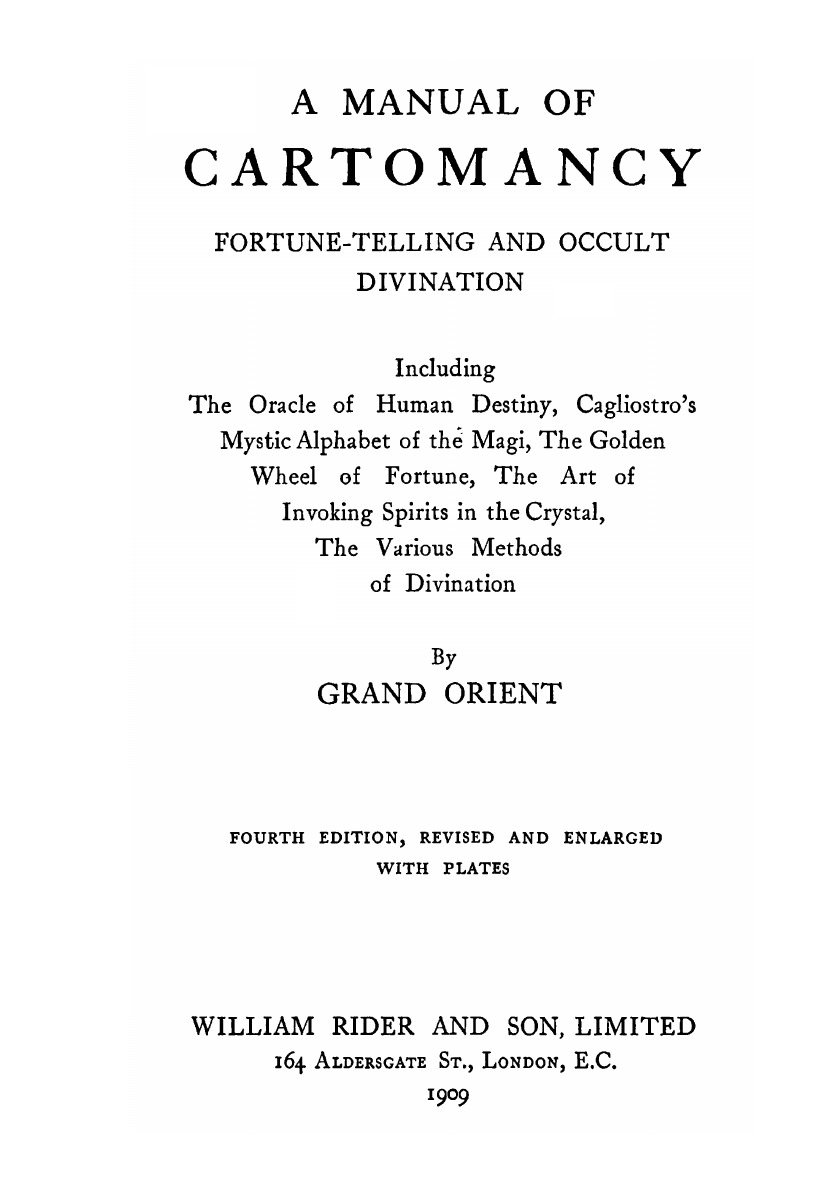 Including the oracle of human destiny, Cagliostro's mystic alphabet of the magi, The golden wheel of fortune, The art of invoking spirits in the crystal, The various methods of divination