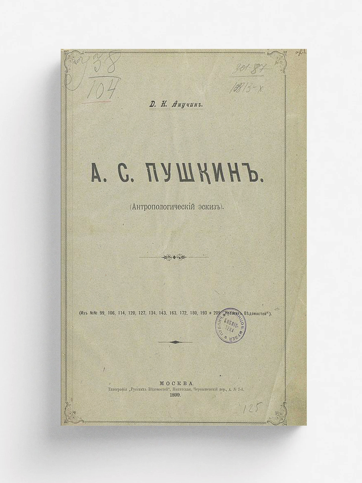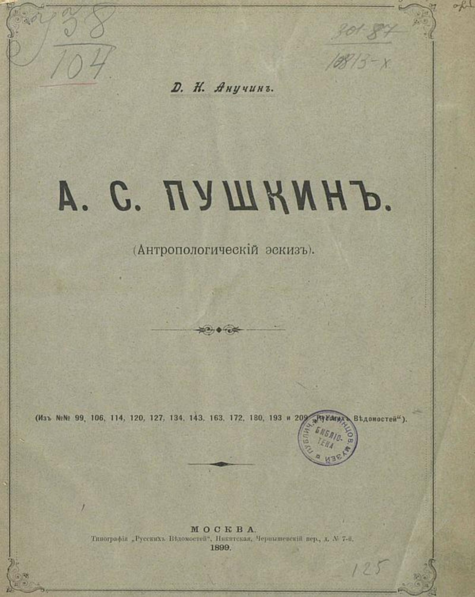 Анучин, Дмитрий Николаевич (1843–1923). А. С. Пушкин: (Антропол. эскиз) / Д. Н. Анучин. — Москва: тип. «Русск. ведомостей», 1899. — 44 с.; 30.