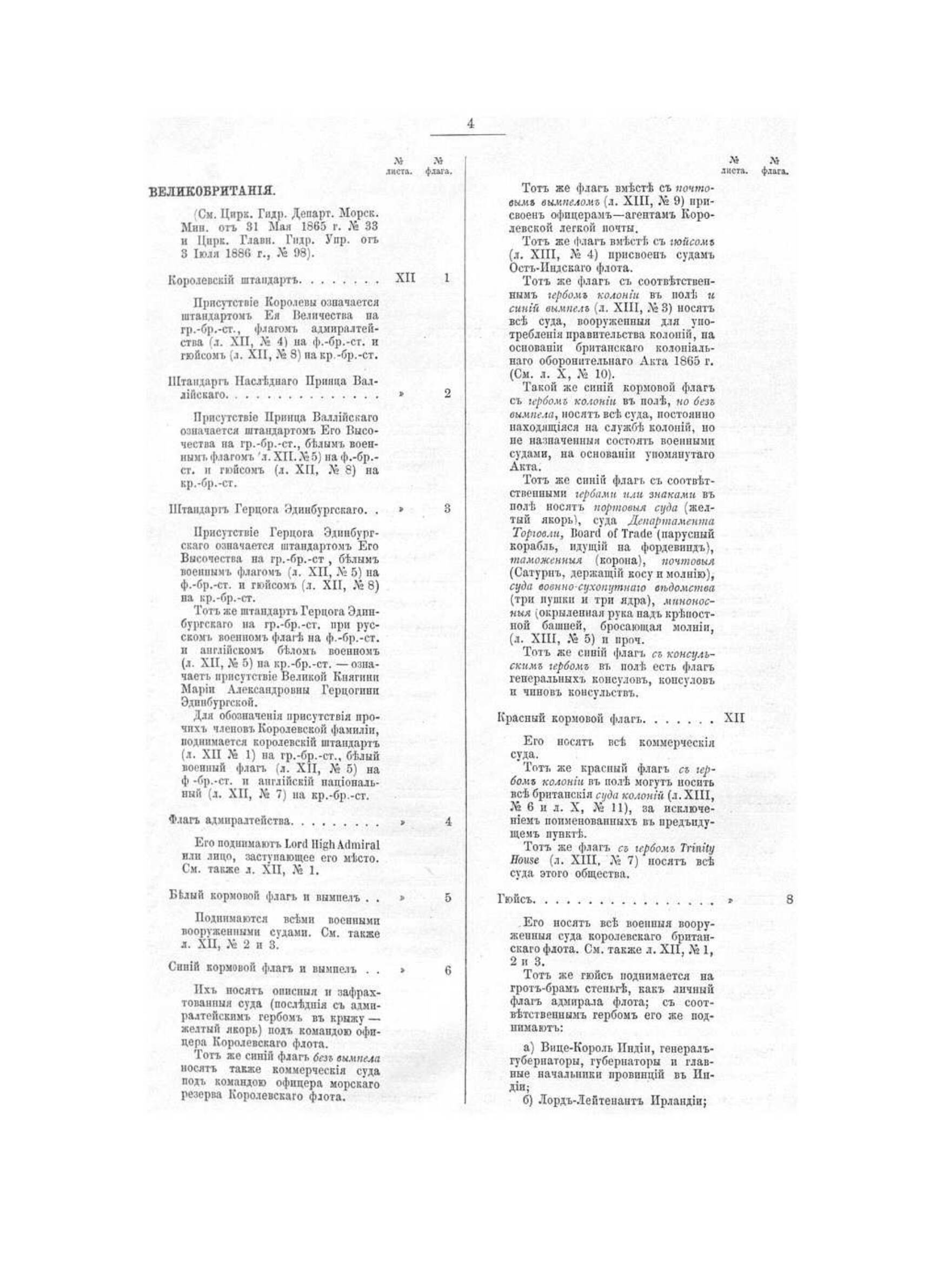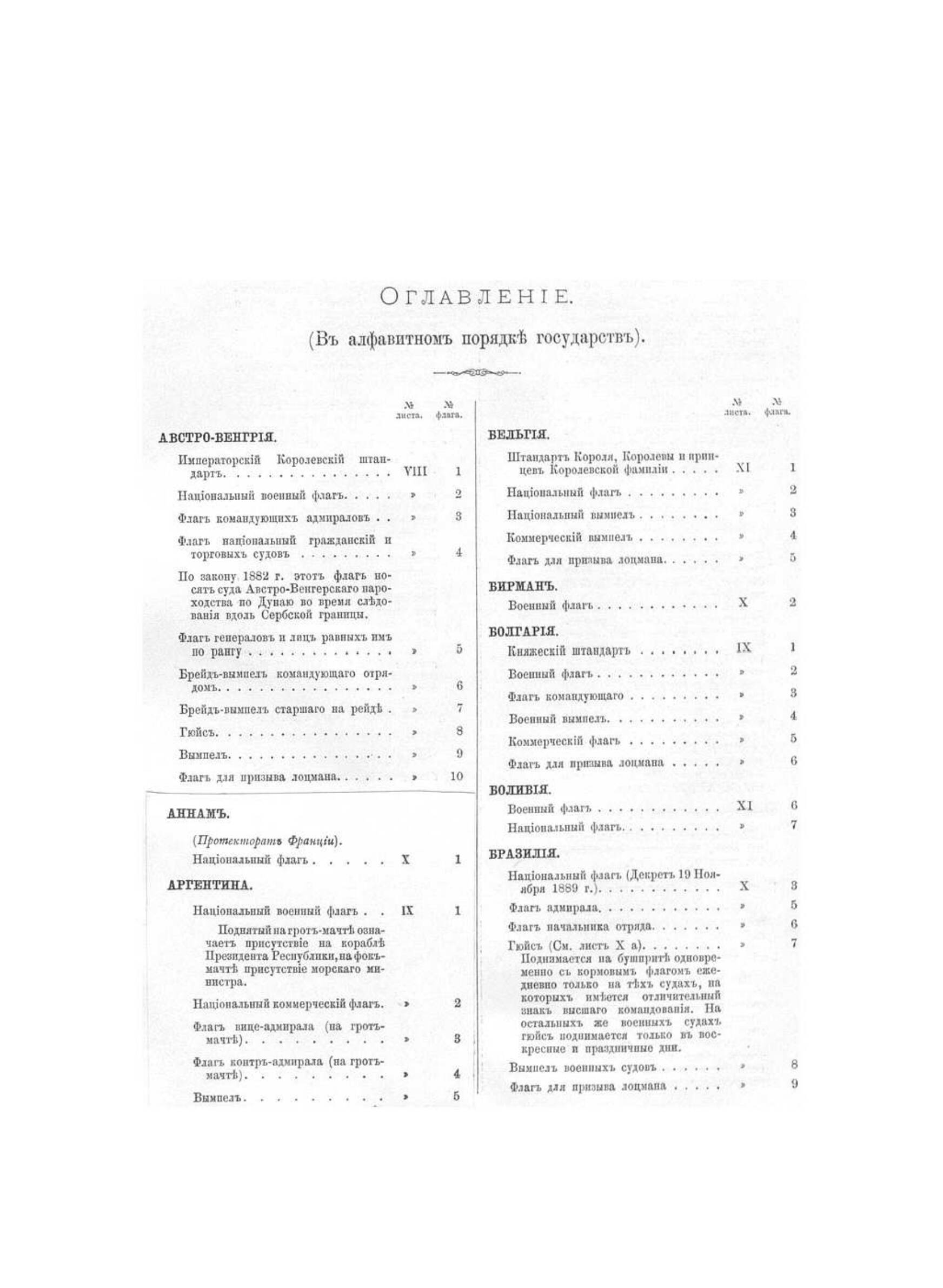 В альбоме приведены цветные рисунки штандартов, флагов и вымпелов Российской империи и иностранных государств (более 60 государств), таких как Австро-Венгрии, Аргентины, Бельгии, Болгарии, Боливии, Бразилии, Великобритании, Венесуэлы, Гватемалы, Германии, Греции, Дании, Египта, Испании, Италии, Китая, Кореи, Коста-Рики, Либерии, Марокко, Мексики, Нидерландов, Норвегии и многих других. Из флагов Российской империи представлены: адмиральские флаги, флаги судов, пароходов и яхт-клубов, флаги Соловецкого монастыря и др.