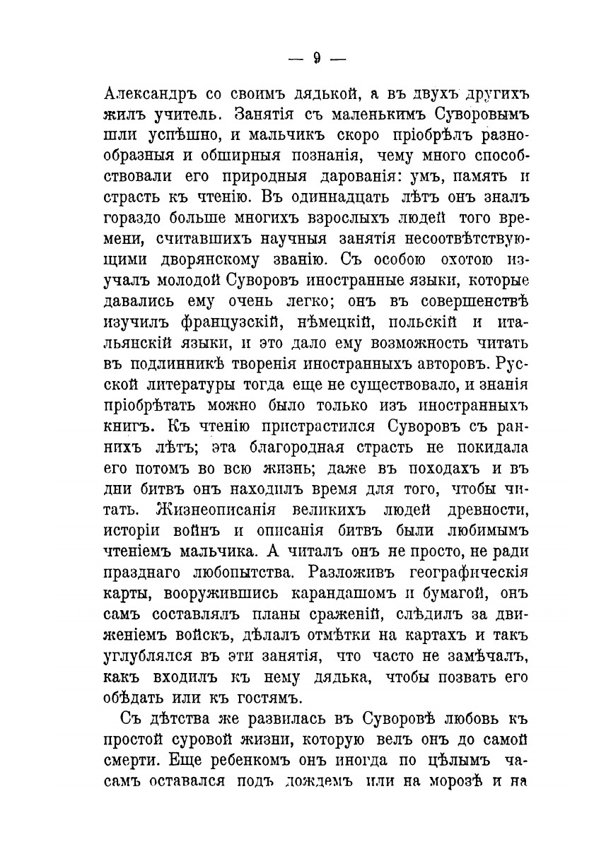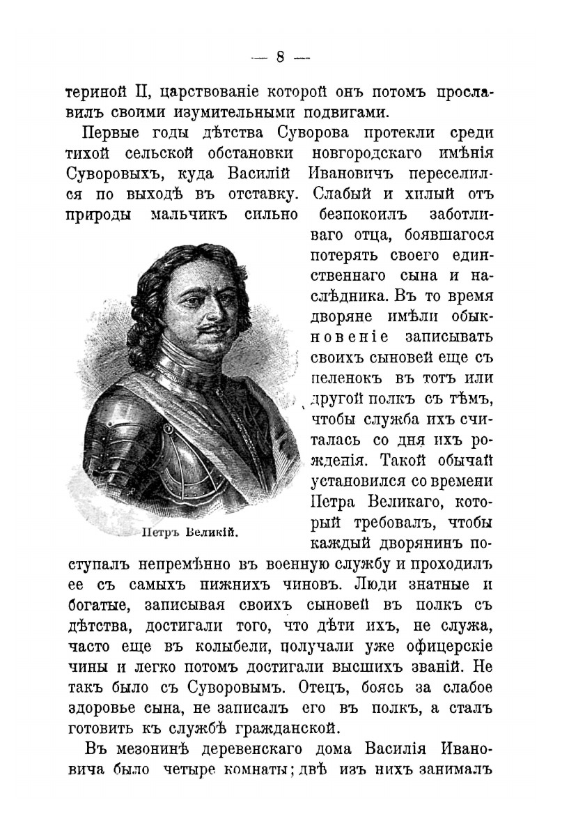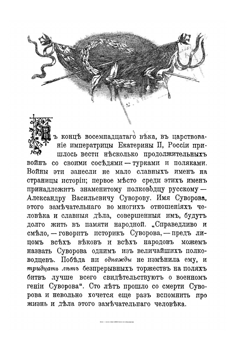 В ряду русских замечательных людей Александр Васильевич Суворов очень резко выделяется во всех отношениях. Особенно ярко и внушительно проявилось это в возвышении Суворова, заурядного русского дворянина, до княжеского достоинства и степени фельдмаршала и генералиссимуса с присвоением ему притом звания «принца» и «царских почестей». Такое возвышение произошло наперекор очень сложным неблагоприятным обстоятельствам, преследовавшим Суворова всю жизнь. Суворов — изумительно цельный тип «военного человека» вообще, и буквально единственный в мировой истории войн пример солдата-фельдмаршала-генералиссимуса. Путем самообразования он не только достиг самого видного и почетного положения в военном отношении, но и занял даже совершенно уединенное место во всей истории военного дела.