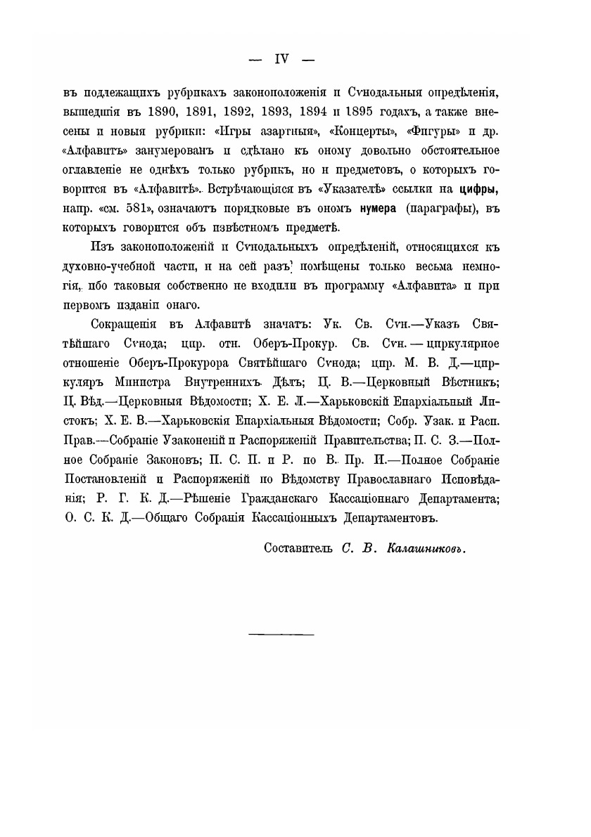 Алфавитный указатель действующих и руководственных канонических постановлений, указов, определений и распоряжений Святейшаго правительствующаго синода (1721-1895 г. включительно) и гражданских законов, относящихся к Духовному ведомству православнаго исповедания. Издано в Харькове, типография Дарре, 1896 г.