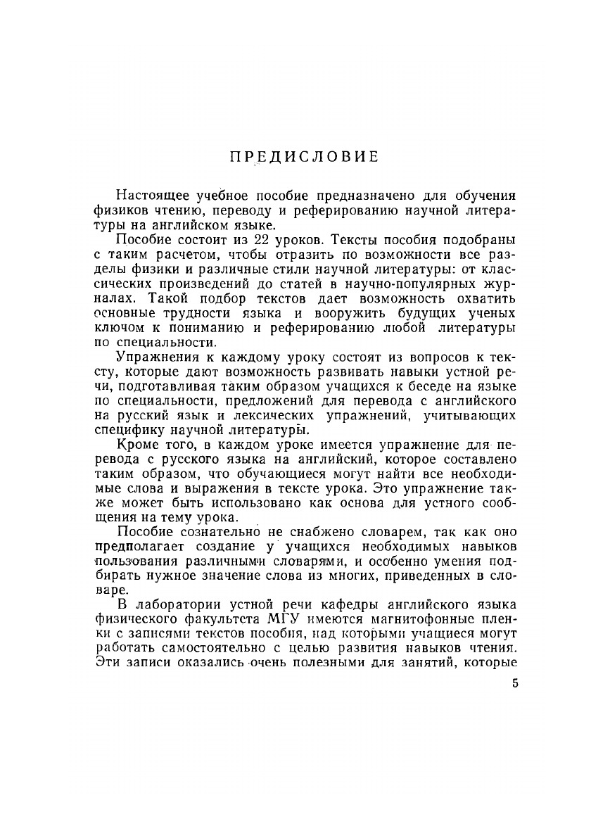 Настоящее учебное пособие предназначено для обучения физиков чтению, переводу и реферированию научной литературы на английском языке.Пособие состоит из 22 уроков. Тексты пособия подобраны с таким расчетом, чтобы отразить по возможности все разделы физики и различные стили научной литературы: от классических произведений до статей в научно-популярных журналах. Такой подбор текстов дает возможность охватить основные трудности языка и вооружить будущих ученых ключом к пониманию и реферированию любой литературы по специальности. Упражнения к каждому уроку состоят из вопросов к тексту, которые дают возможность развивать навыки устной речи, подготавливая таким образом учащихся к беседе на языке по специальности, предложений для перевода с английского на русский язык и лексических упражнений, учитывающих специфику научной литературы