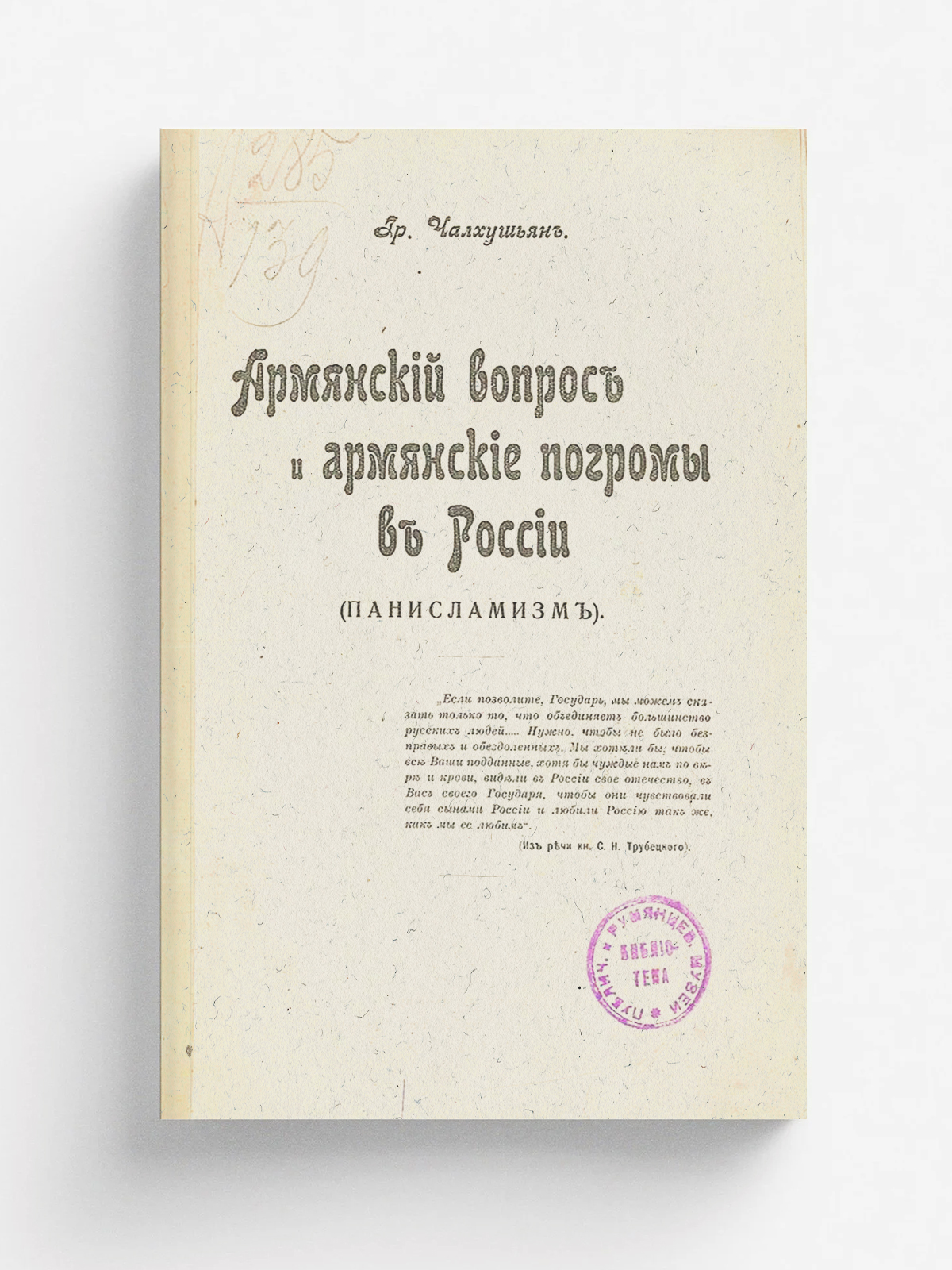 Чалхушьян, Григорий Хачатурович (1861–1939). Армянский вопрос и армянские погромы в России (панисламизм) [Текст] / Гр. Чалхушьян. — Ростов-на-Дону : электро-печатня А. Тер-Абрамиан, 1905. — 96 с.; 21 см.