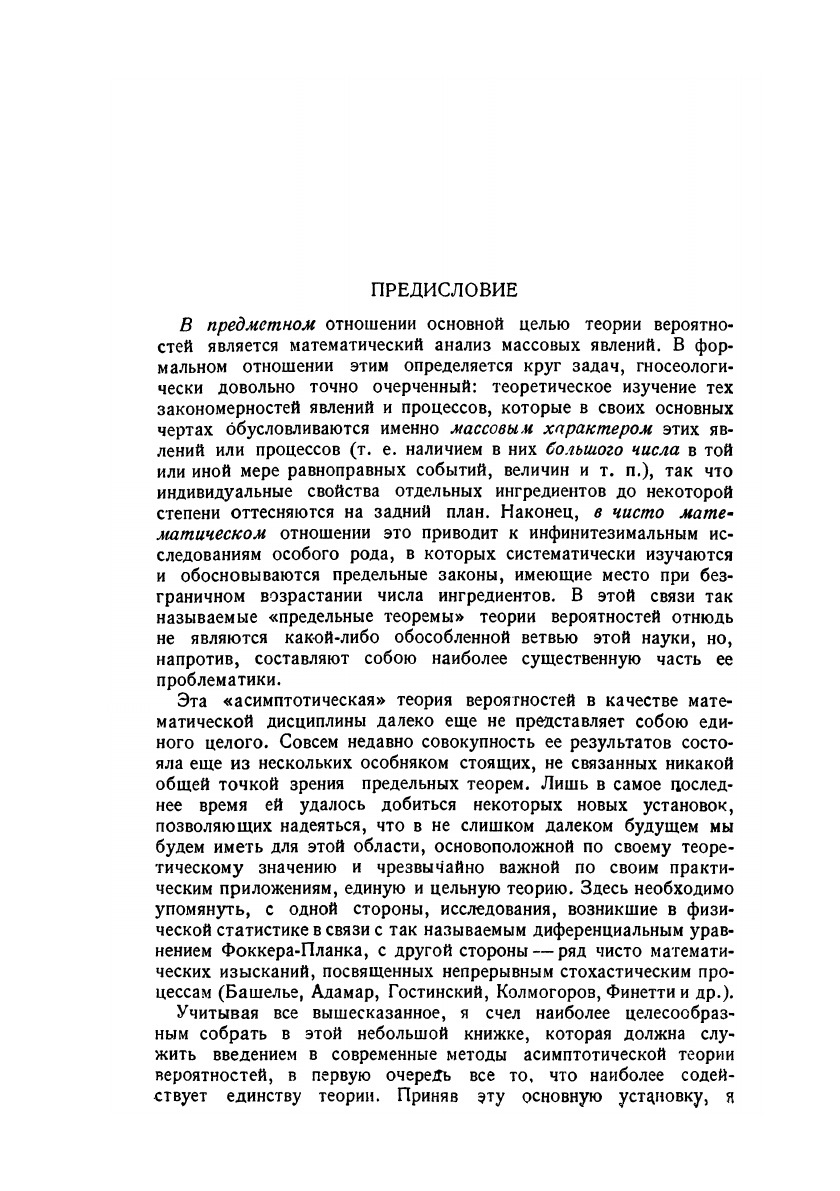 Математика в монографиях. Серия обзоров. Книга 3. Асимптотические законы теории вероятностей.Под редакцией акад. И. М. Виноградова, проф. А. Н. Колмогорова, проф. Л. А. Люстерника, проф. А. И. Плеснера. Перевод с немецкого И. С. Пискунова и А. Н. Эрастовой.В предметом отношении основной целью теории вероятностей является математический анализ массовых явлений. В формальном отношении этим определяется круг задач, гносеологически довольно точно очерченный; теоретическое изучение тех закономерностей явлений и процессов, которые в своих основных чертах обуславливаются именно массовым характером этих явлений или процессов (т.е. наличие в них большого числа в той или иной мере равноправных событий, величин и т.п.), так что индивидуальные свойства отдельных ингредиентов до некоторой степени оттесняются на задний план.Наконец, в чисто математическом отношении это приводит к инфинитезимальным исследованиям особого рода, в которых систематически изучаются и обосновываются предельные законы, имеющие место при безграничном возрастании числа ингредиентов. В этой связи так называемые "предельные теоремы" теории вероятностей отнюдь не являются какой-либо обособленной ветвью этой науки, но, напротив, составляют собою наиболее существенную часть её проблематики.