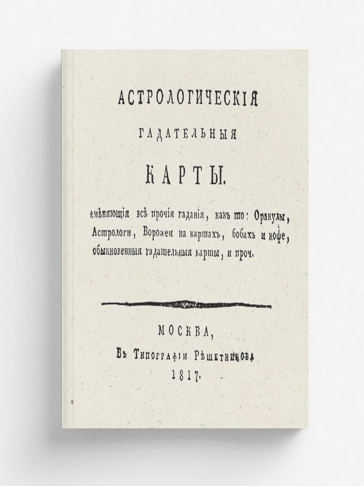 Астрологические гадательные карты. [Текст] : Заменяющищие все прочие гадания, как то: оракулы, астрологи, ворожеи на картах, бобах и кофе, обыкновенныя гадательныя карты, и проч. - Москва : В типографии Решетникова, 1817. - [4], 36 с.; 9x12 см.