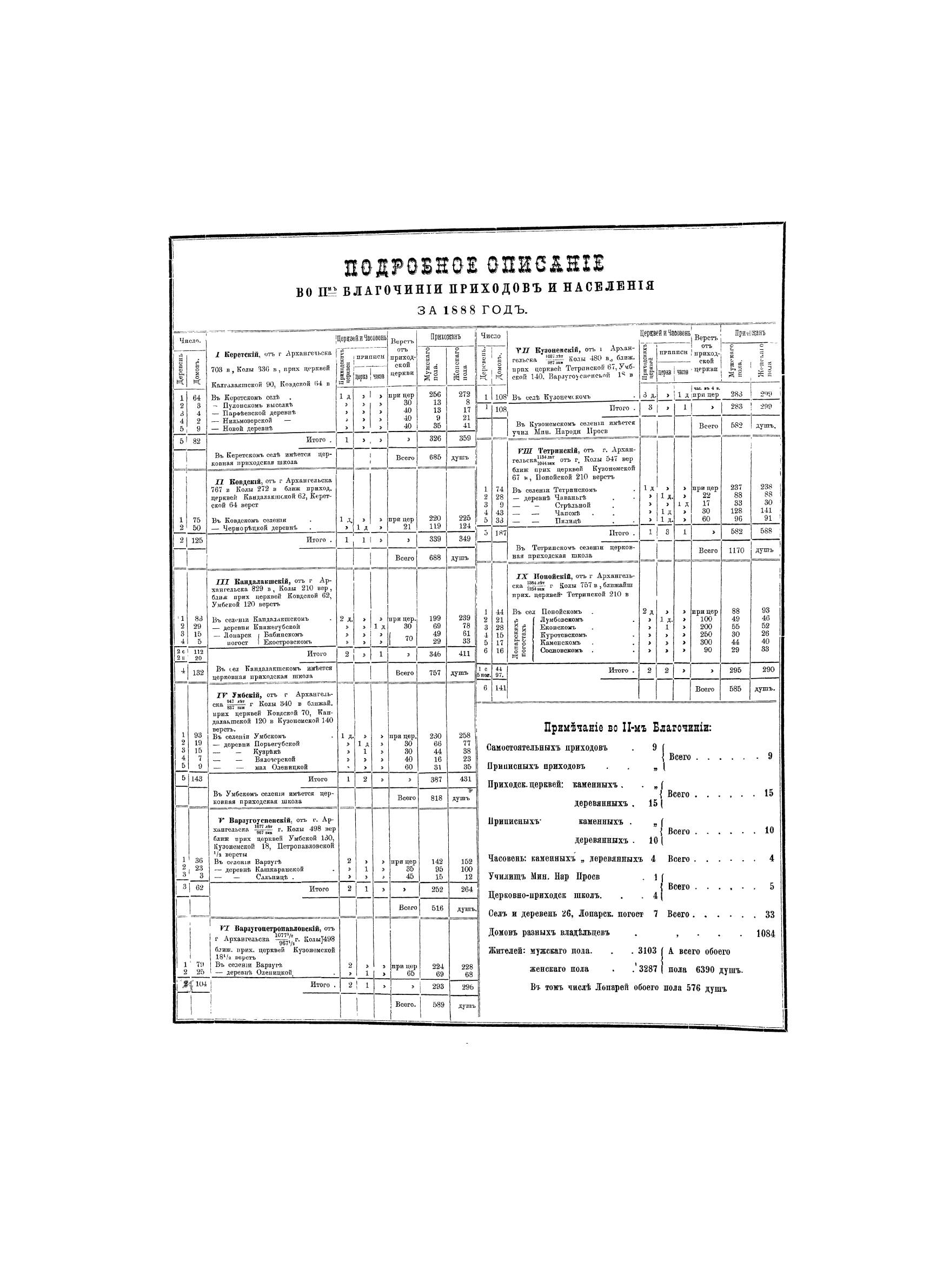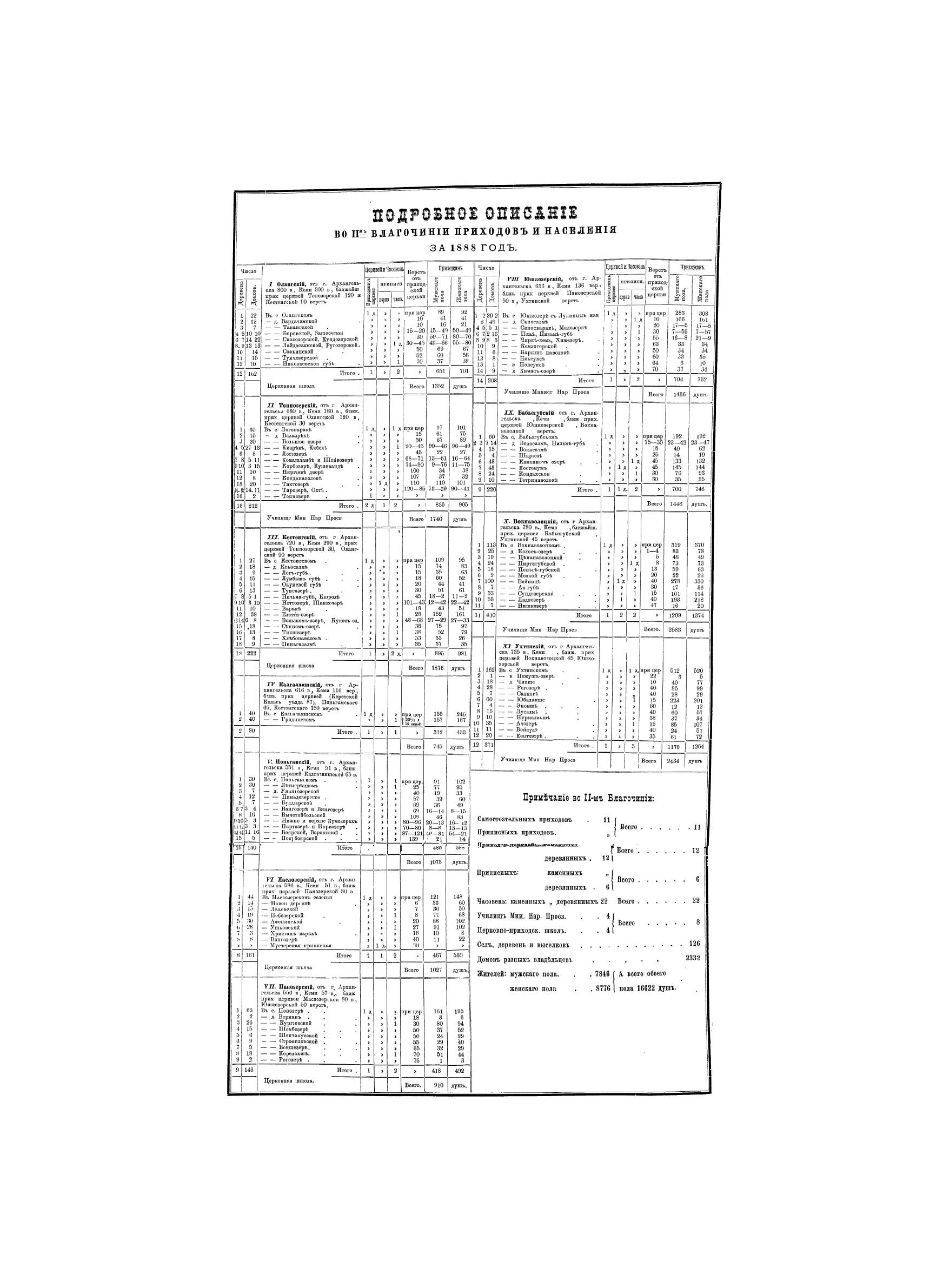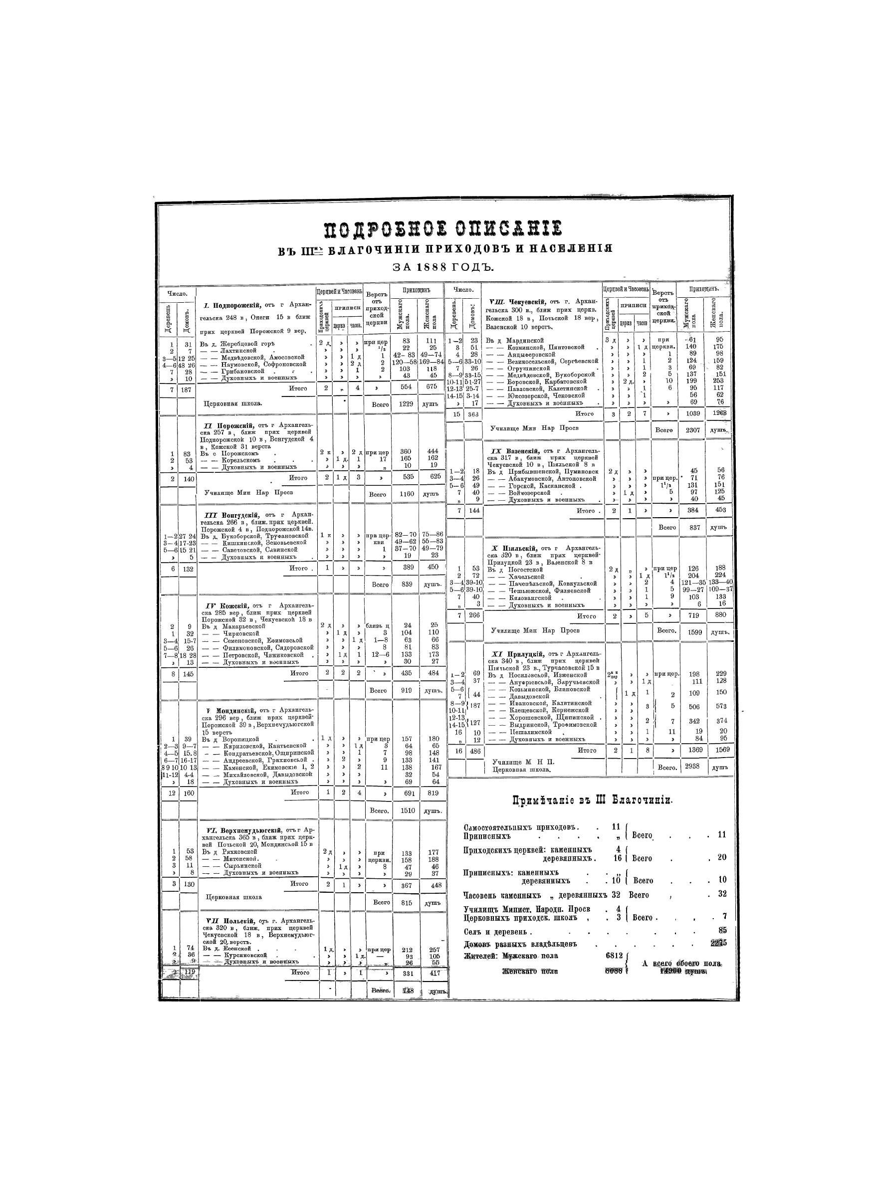 Атлас Архангельской епархии состоит из 30 карт (Уезды: Кольский, Кемский, Онежский, Архангельский, Холмогорский, Шенкурский, Пинежский, Мезенский). На картах обозначены: приходские и приписные церкви, часовни, училища, школы, деревни, выселки, погосты, раскольничьи скиты. К каждой карте прилагается статистическое описание приходов и населения.