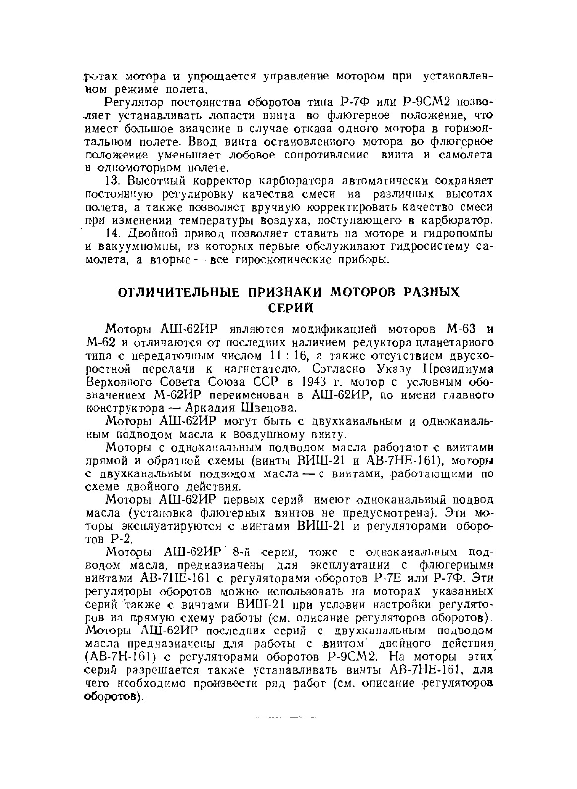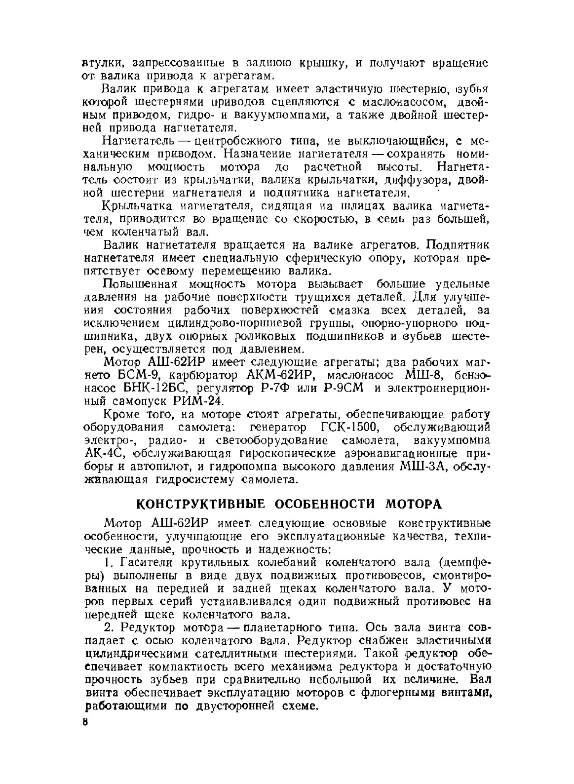 Мотор АШ-62ИР представляет собой звездообразный девятицилиндровый двигатель воздушного охлаждения. Большой запас взлетной мощности и небольшая высотность мотора делают его надежным и экономичным в эксплуатации.Имеющиеся на моторе агрегаты обеспечивают работу многообразного оборудования современного самолета. Мотор АШ-62ИР (рис. 1—4) прост в эксплуатации и техническом обслуживании.