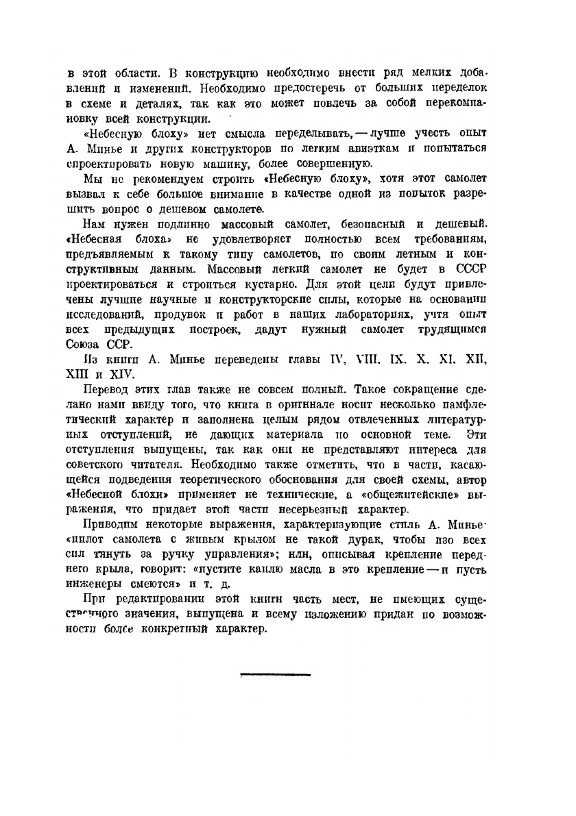 Сокращенный перевод с английского книги А. Минье "Небесная блоха" дает описание конструкции и процесса изготовления маломощного самолета - авиэтки. Перевод снабжен комментариями редактора. В тексте даны эскизы отдельных деталей и частей самолета. Перевод книги сделан с целью ознакомления советского читателя с конструкцией маломощного самолета, получившего большую известность как у нас, так за границей, с соответствующей критической оценкой ее достоинств и недостатков. В конце книги дана статья инж. Б. Н. Воробьева "За общедоступный самолет"