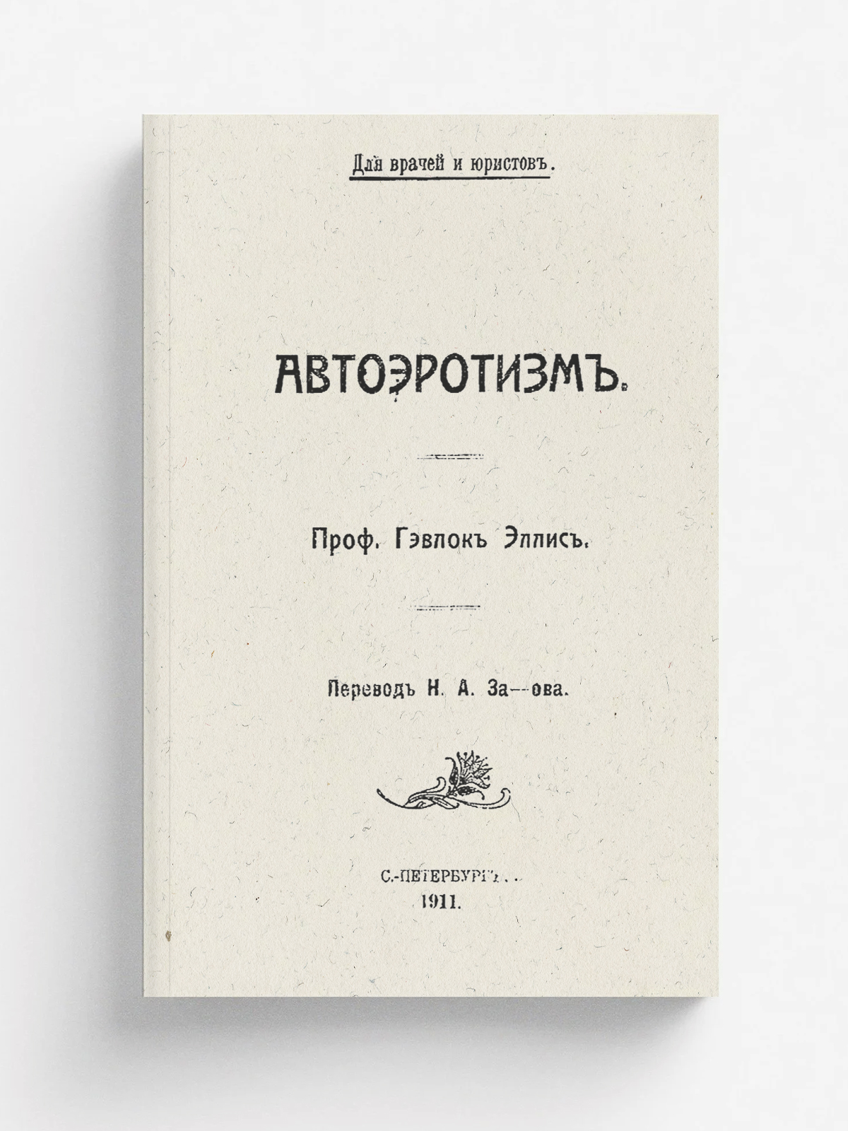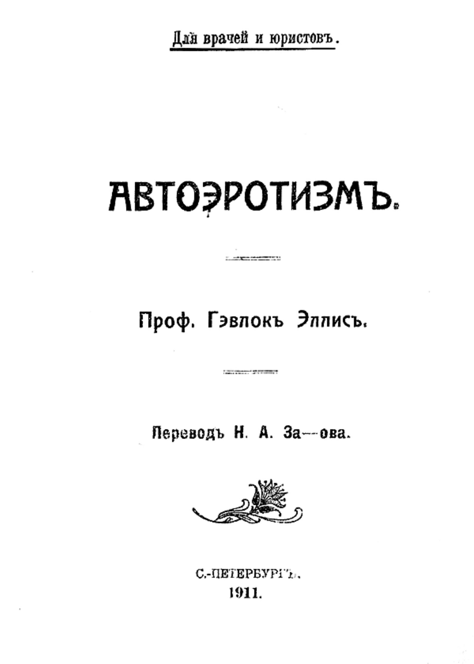 Эллис, Хейвлок (1859–1939). Автоэротизм : Для врачей и юристов / [Соч.] Проф. Гэвлок Эллис; Пер. Н. А. За-ова. — Санкт-Петербург : тип. «Луч», 1911. — 232 с.; 19.