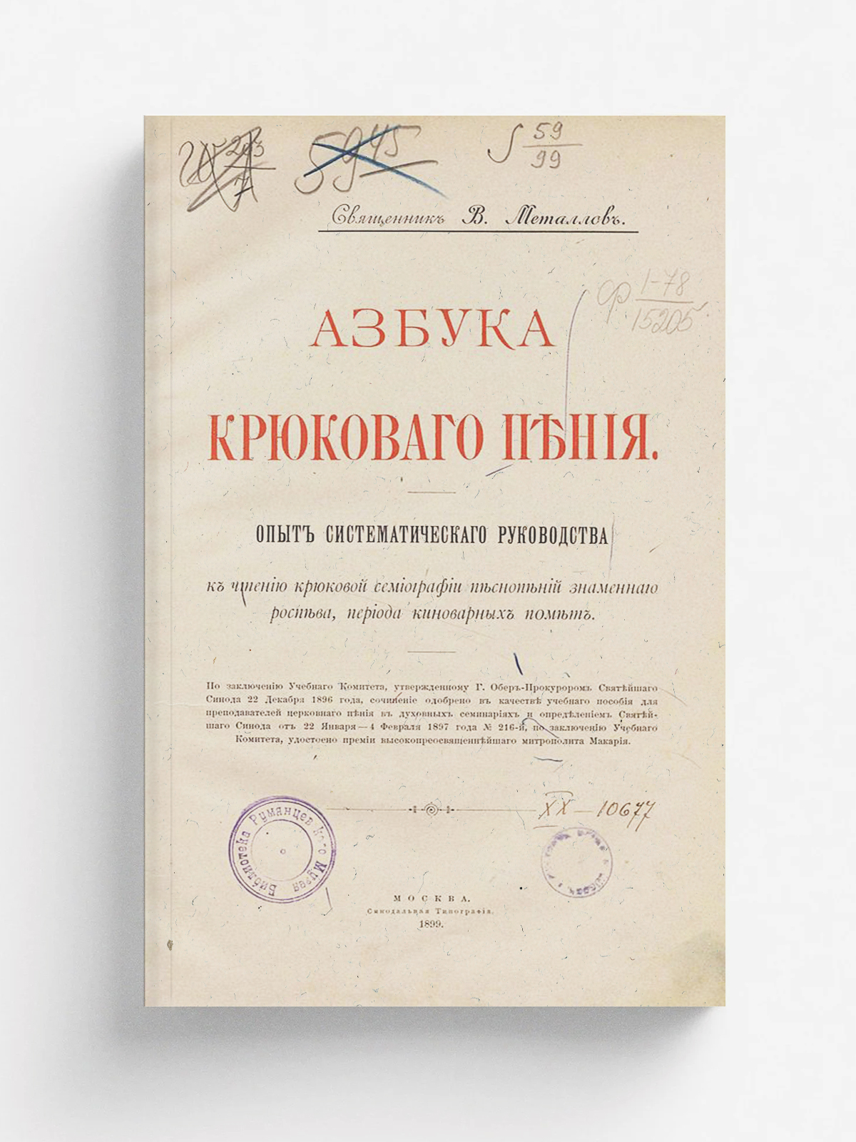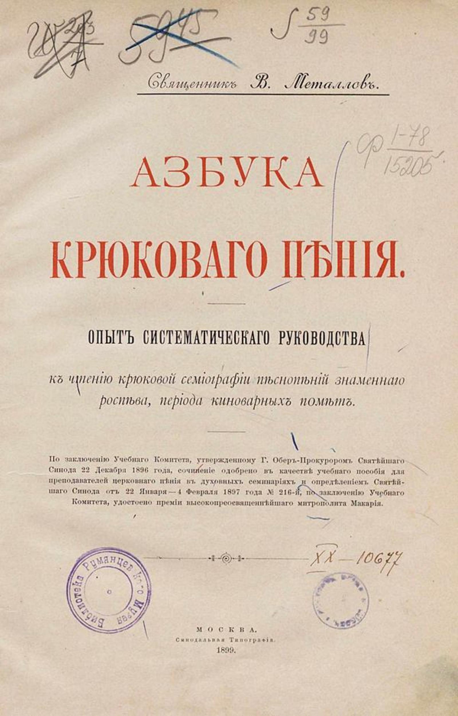 Металлов, Василий Михайлович (1862–1926). Азбука крюкового пения : Опыт сист. руководства к чтению крюковой семиографии песнопений знаменного роспева, периода киноварных помет. — Москва : Синод. тип., 1899. — [2], IV, VI, 130 с. : нот.; 26.