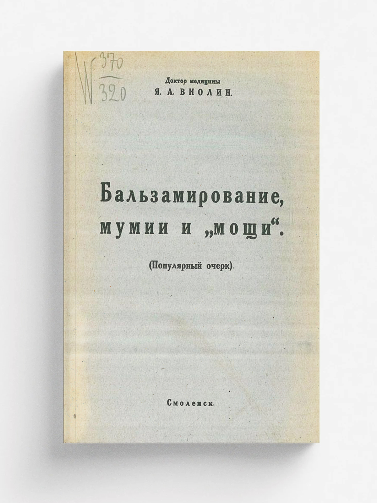 Виолин, Яков Абрамович (1866–). Бальзамирование, мумии и «мощи» : (Попул. очерк) / Д-р мед. Я. А. Виолин. — Смоленск : [б. и.], [1926] ([тип. Военпромторгзапа]). — 16 с.; 17 см.