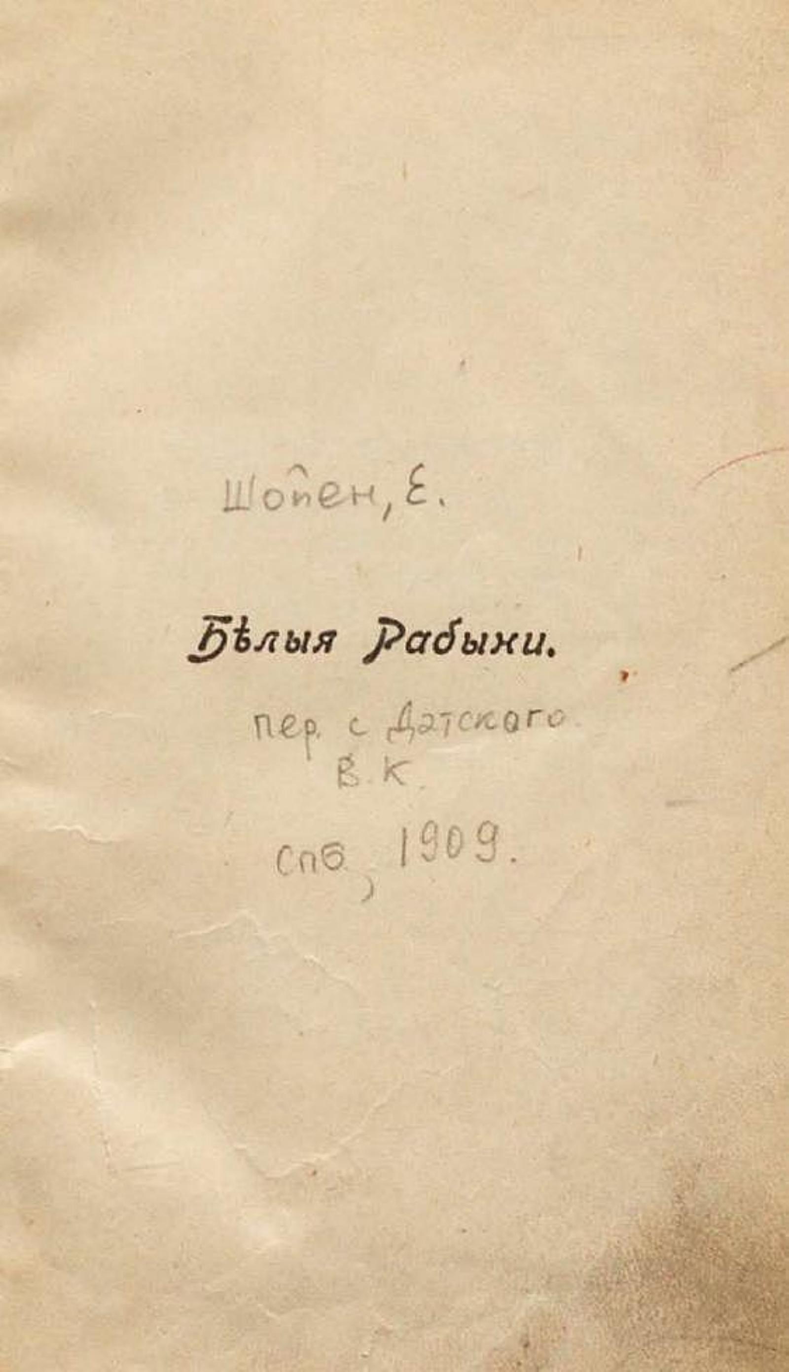 Шойен, Елизабет. Белые рабыни / Пер. с датск. В. К. — Санкт–Петербург : типо–лит. К. И. Лингард, 1909. — 240 с.; 19.