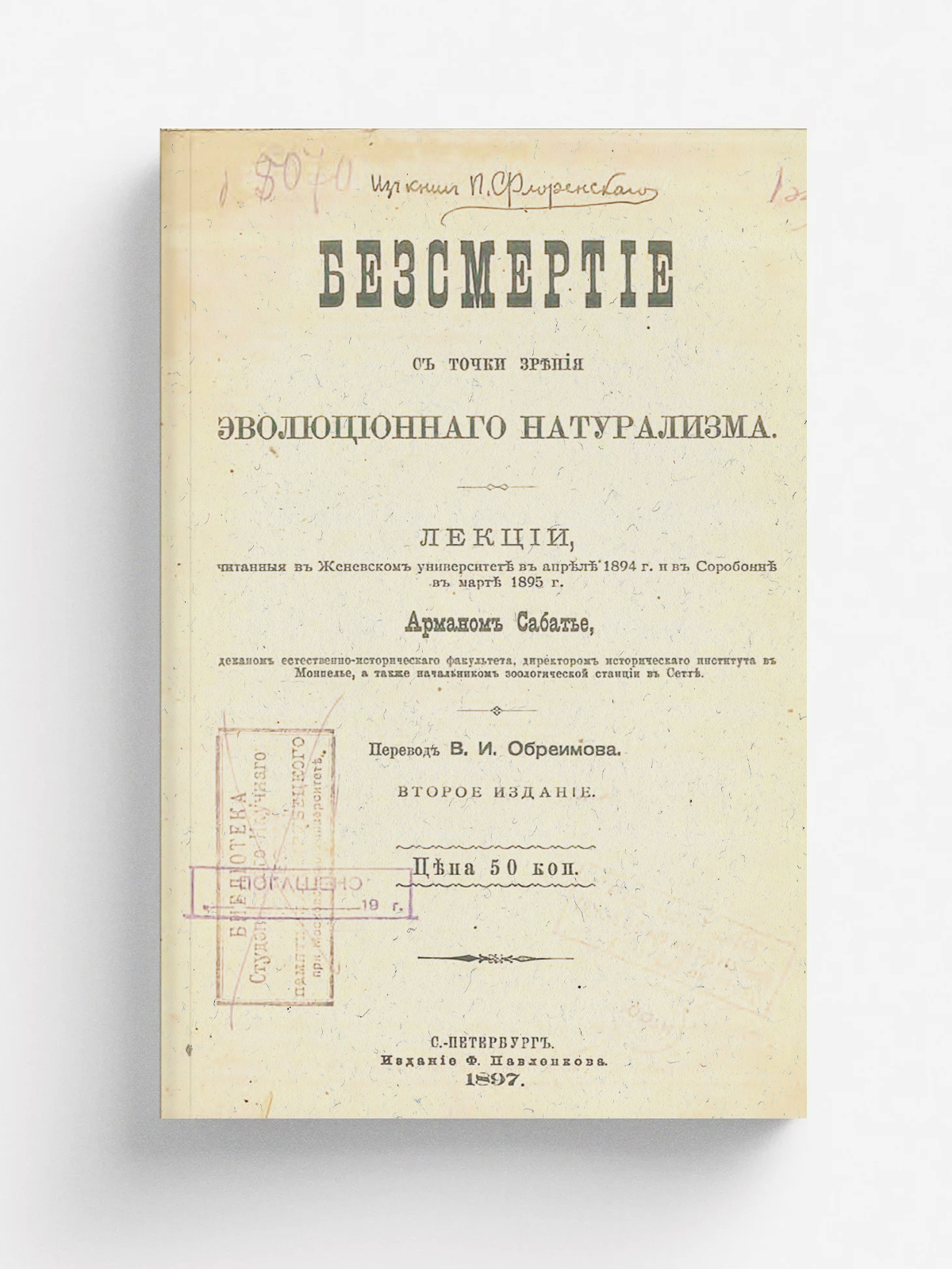Сабатье, Арман (1834–1910). Безсмертие с точки зрения эволюционнаго натурализма [Текст] : лекции, читанные в Женевском ун-те в апреле 1894 г. и в Сорбонне в марте 1895 г. Арманом Сабатье, деканом Естественно-исторического фак., директором Исторического ин-та в Монпелье, а также начальником Зоологической станции в Сетте / пер. В. Обреимова. — 2-е изд. — Санкт-Петербург : Ф. Павленков, 1897. — 158, II с.; 25 см.