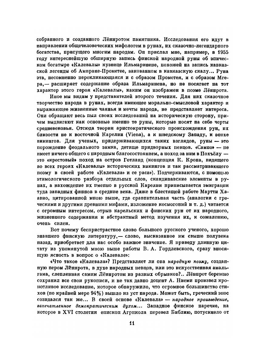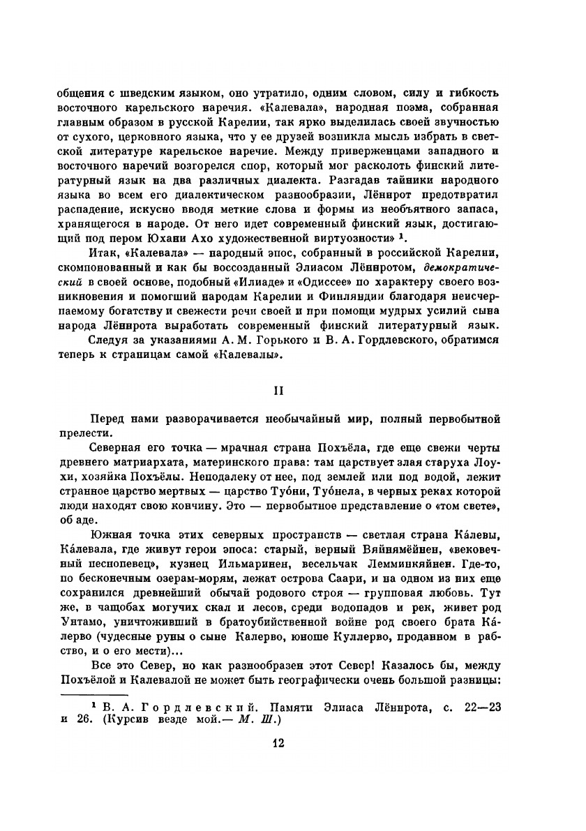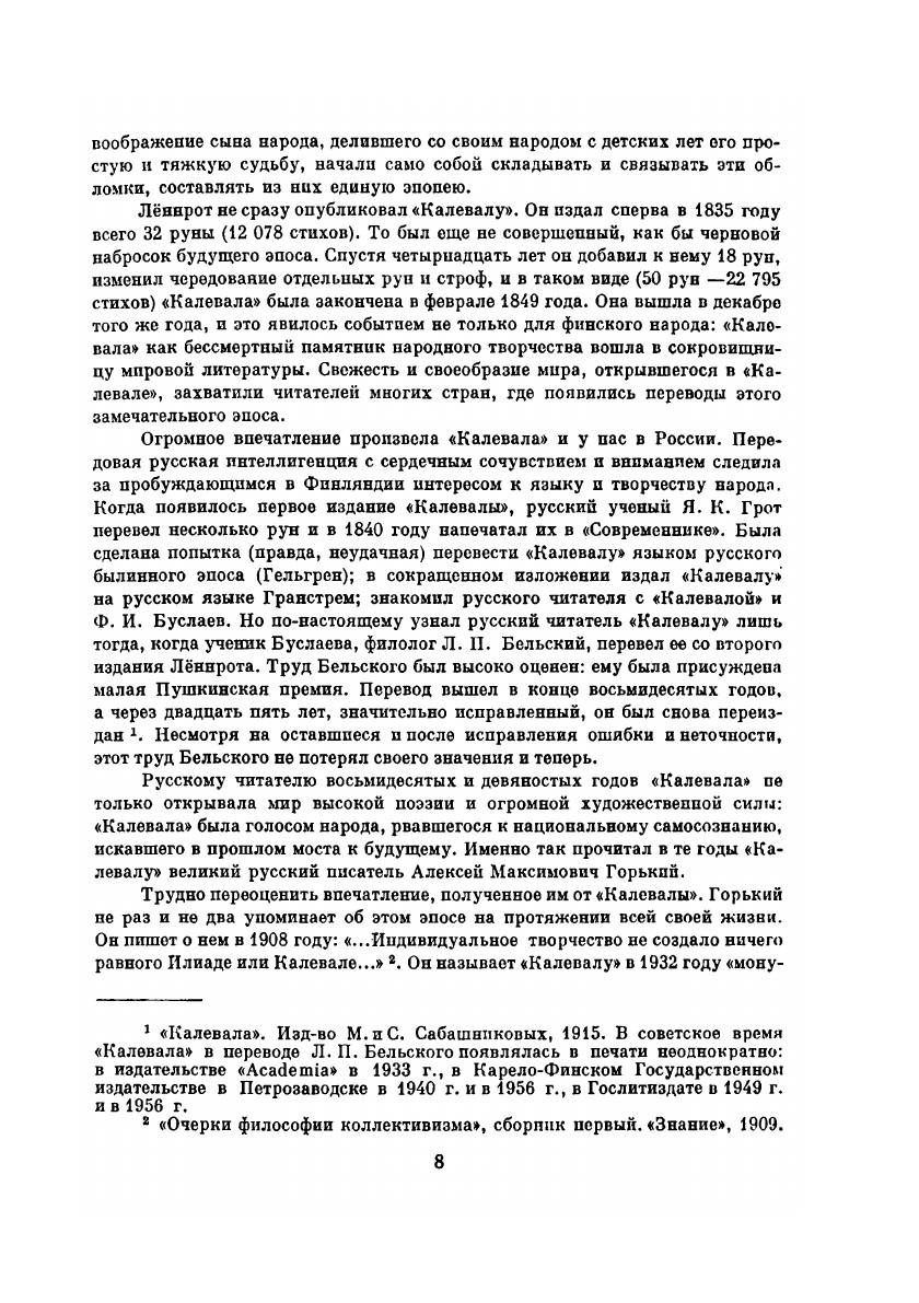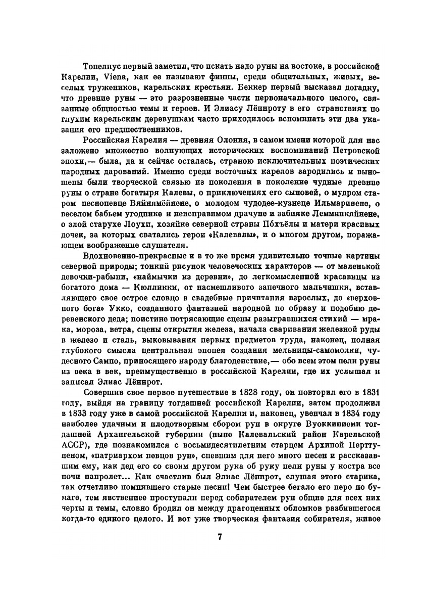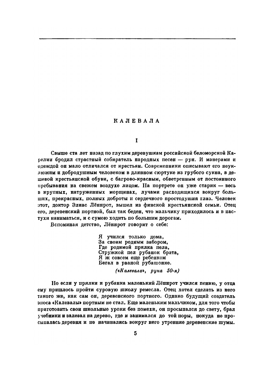 «Калевала» — народный эпос, собранный в российской Карелии, скомпонованный и как бы воссозданный Элиасом Лённротом, демократический в своей основе, подобный «Иллиаде» и «Одиссее» по характеру своего возникновения и помогавший народам Карелии и Финляндии благодаря неисчерпаемому богатству и свежести речи своей и при помощи мудрых усилий сына народа Лённрота выработать современный финский литературный язык. «Калевала» — это великий и цельный памятник народного творчества. Вечно молодой старец Вяйнямёйнен — любовь и надежда простого народа, «работающий для блага грядущих поколений». Во множестве народных рун он отразился именно таким. Вступительная статья Мариэтты Шагинян, перевод с финского Л. Бельского. Иллюстрации А. Галлен-Каллелы.