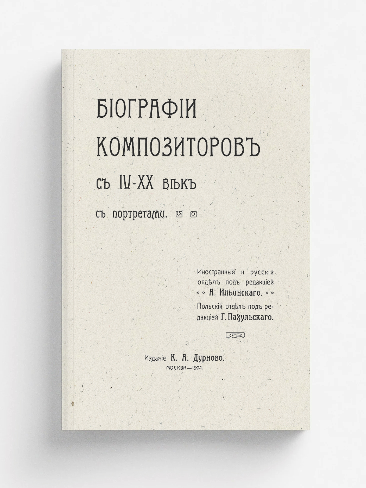 Биографии композиторов с IV–XX век : Иностр. и рус. отд. под ред. А. Ильинского. Пол. отд. под ред. Г. Пахульского. — Москва : Дурново, 1904. — 968 с. разд. паг., 29 л. ил. : ил.; 27.