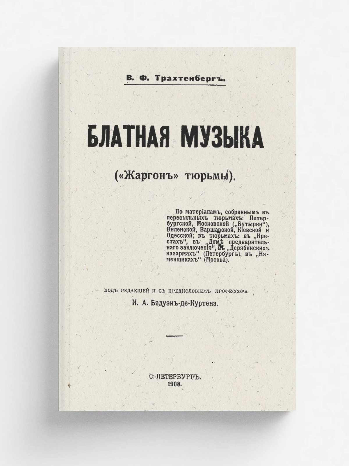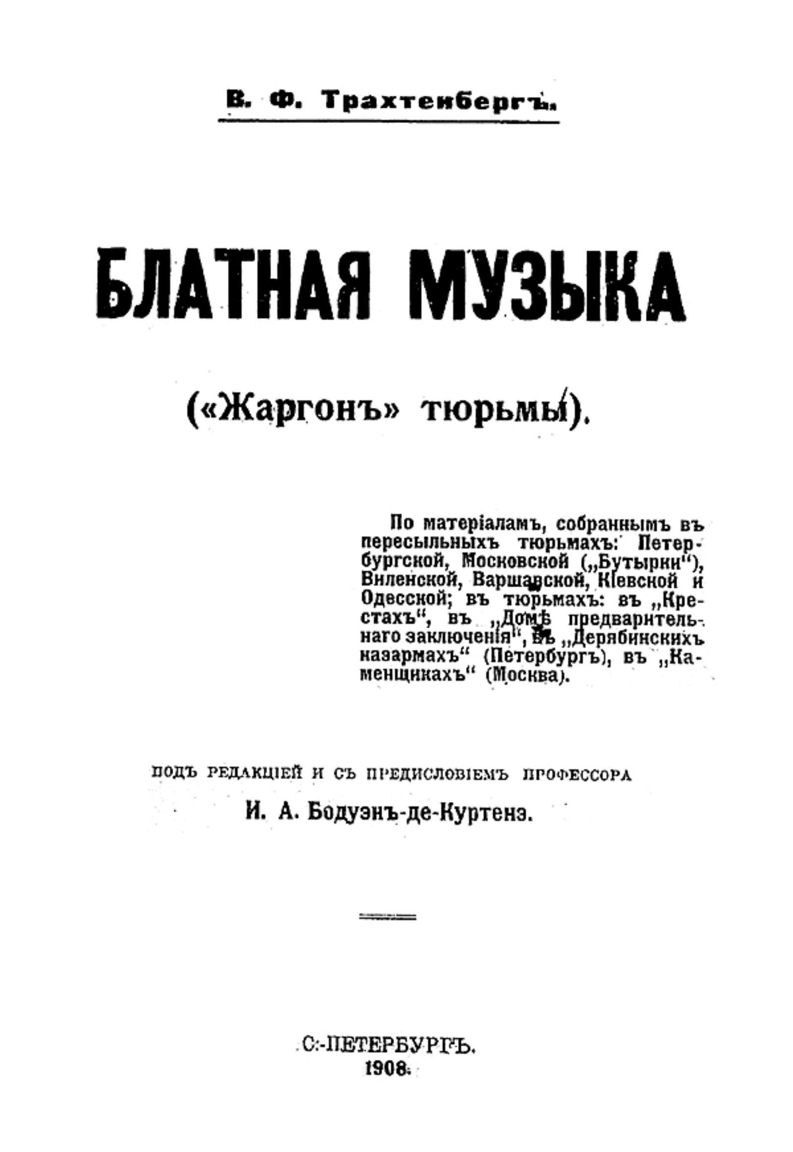 Трахтенберг, Василий Филиппович (1881—1940). Блатная музыка : («Жаргон» тюрьмы) : По материалам, собр. в пересыл. тюрьмах: Петерб., Моск. («Бутырки»), ... [и др.] / В. Ф. Трахтенберг; Под ред. и с предисл. проф. И. А. Бодуэн-де-Куртенэ. — Санкт-Петербург : тип. А. Г. Розена, 1908. — XX, 116 с.; 19.