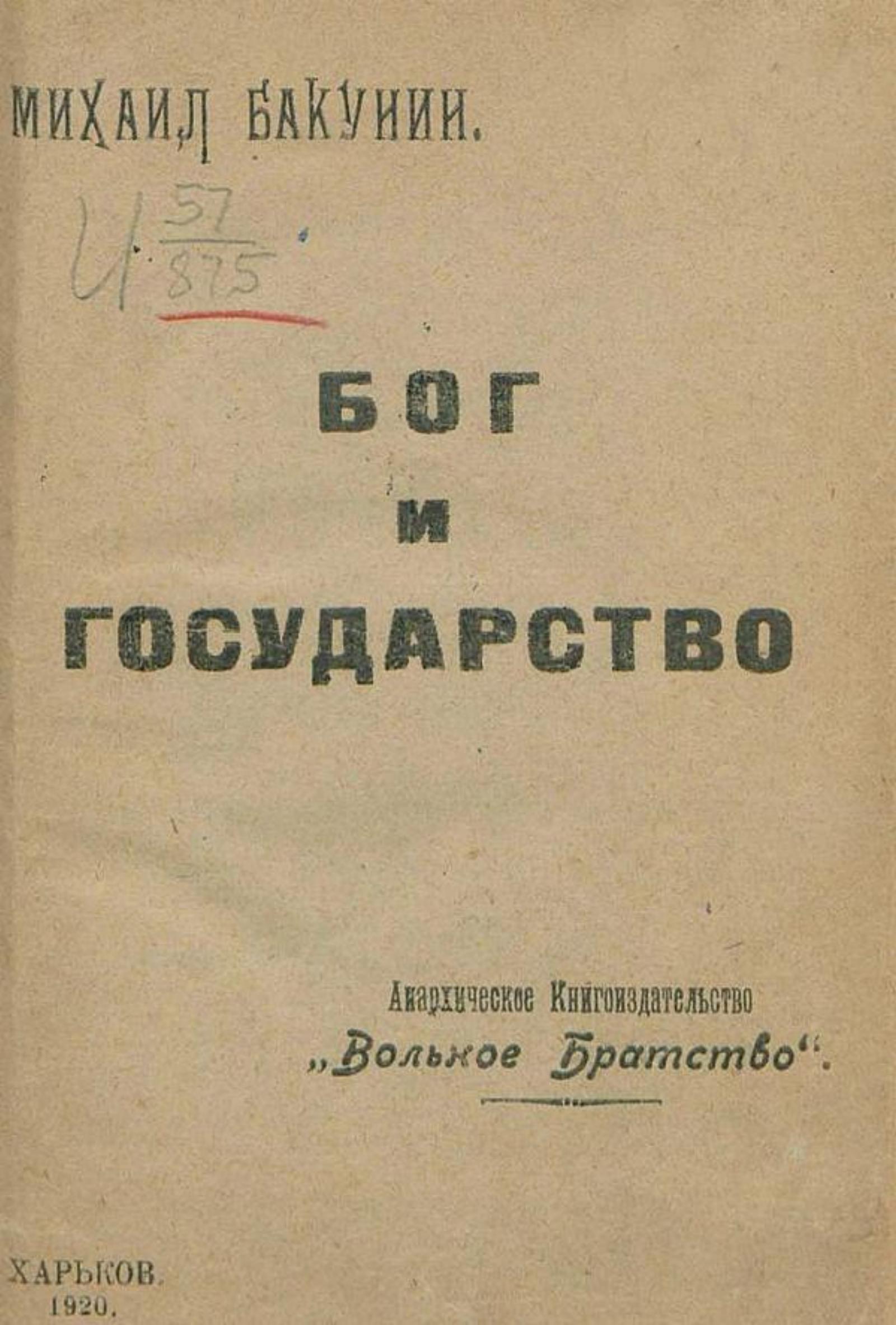Бакунин, Михаил Александрович (1814–1876). Бог и Государство / Михаил Бакунин ; предисл. Элизе Реклю и Кафиеро. — Харьков : Вольное братство, 1920. — 87 с.; 19 см.