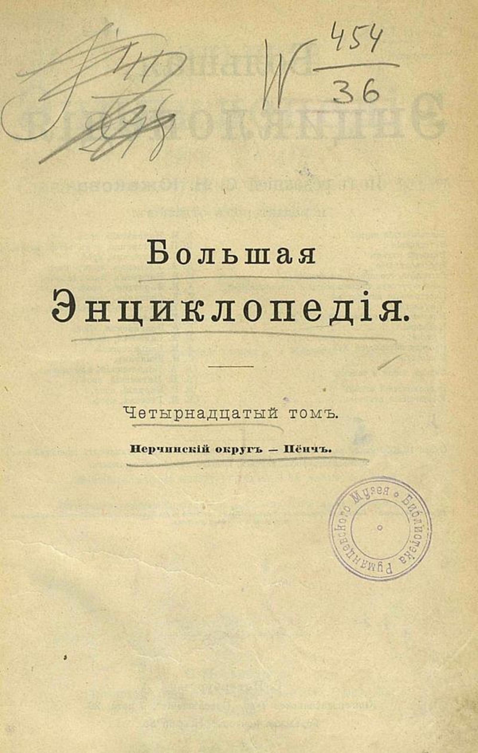 Большая энциклопедия : словарь общедоступных сведений по всем отраслям знания / под ред. С. Н. Южакова [и др.]. — Санкт-Петербург : Книгоиздательское т-во «Просвещение», 1900-[1909]. — 24 см. Т. 14: Нерчинский округ — Пенч [Текст]. — 1904. — VIII, 794 с., [33] л. ил., к. : ил.