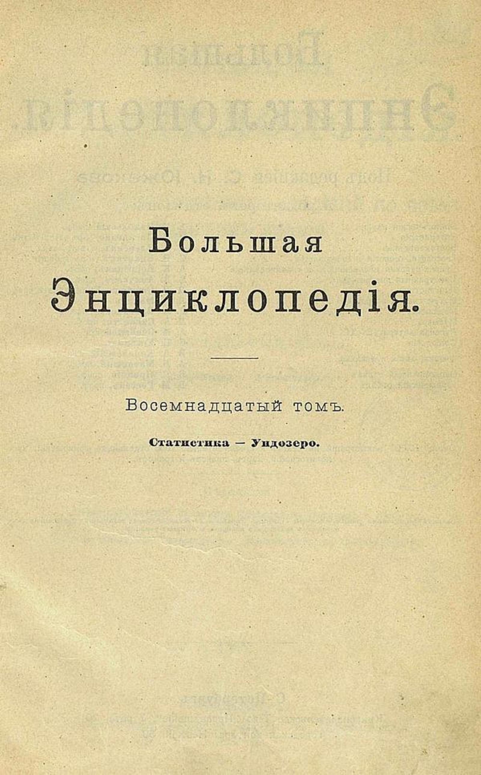 Большая энциклопедия : словарь общедоступных сведений по всем отраслям знания / под ред. С. Н. Южакова [и др.]. — Санкт-Петербург : Книгоиздательское т-во «Просвещение», 1900-[1909]. — 24 см. Т. 18: Статистика — Ундозеро [Текст]. — ценз. 1904. — Разд. паг., 39 л. ил., карт. : ил.