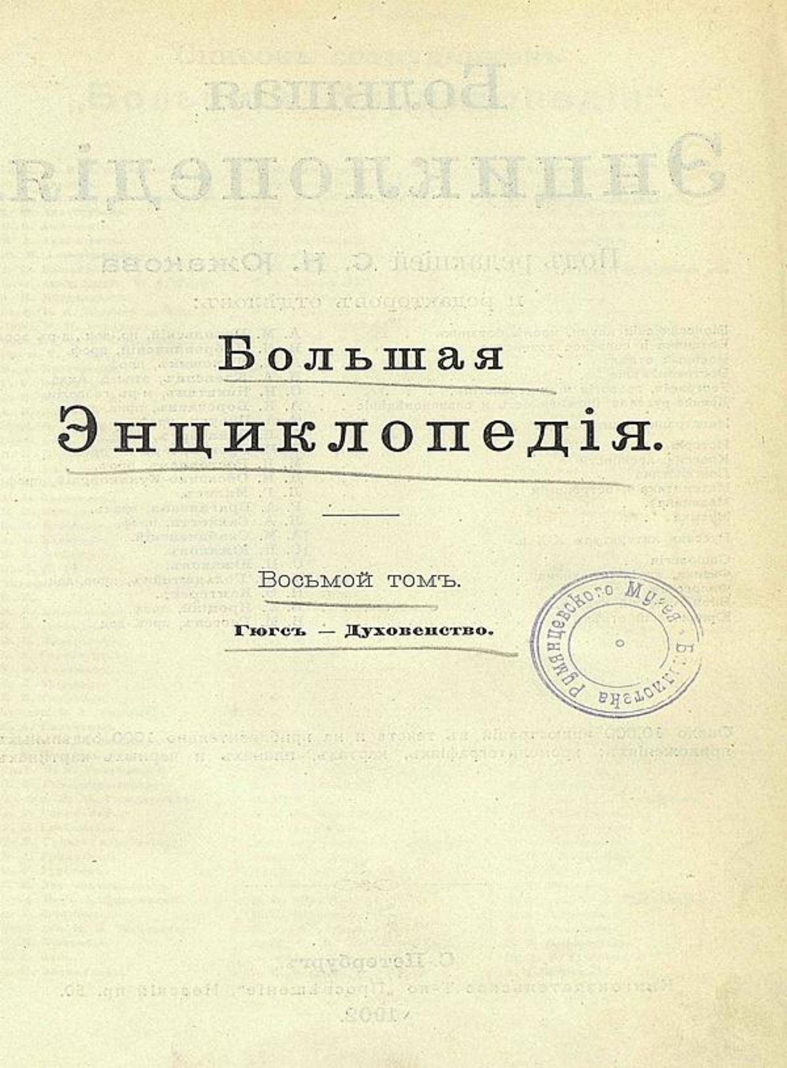 Большая энциклопедия : словарь общедоступных сведений по всем отраслям знания / под ред. С. Н. Южакова [и др.]. — Санкт-Петербург : Книгоиздательское т-во «Просвещение», 1900-[1909]. — 24 см. Т. 8: Гюгс — Духовенство [Текст]. — 1902. — 794, [6] с., [8] л. ил., к. : ил.
