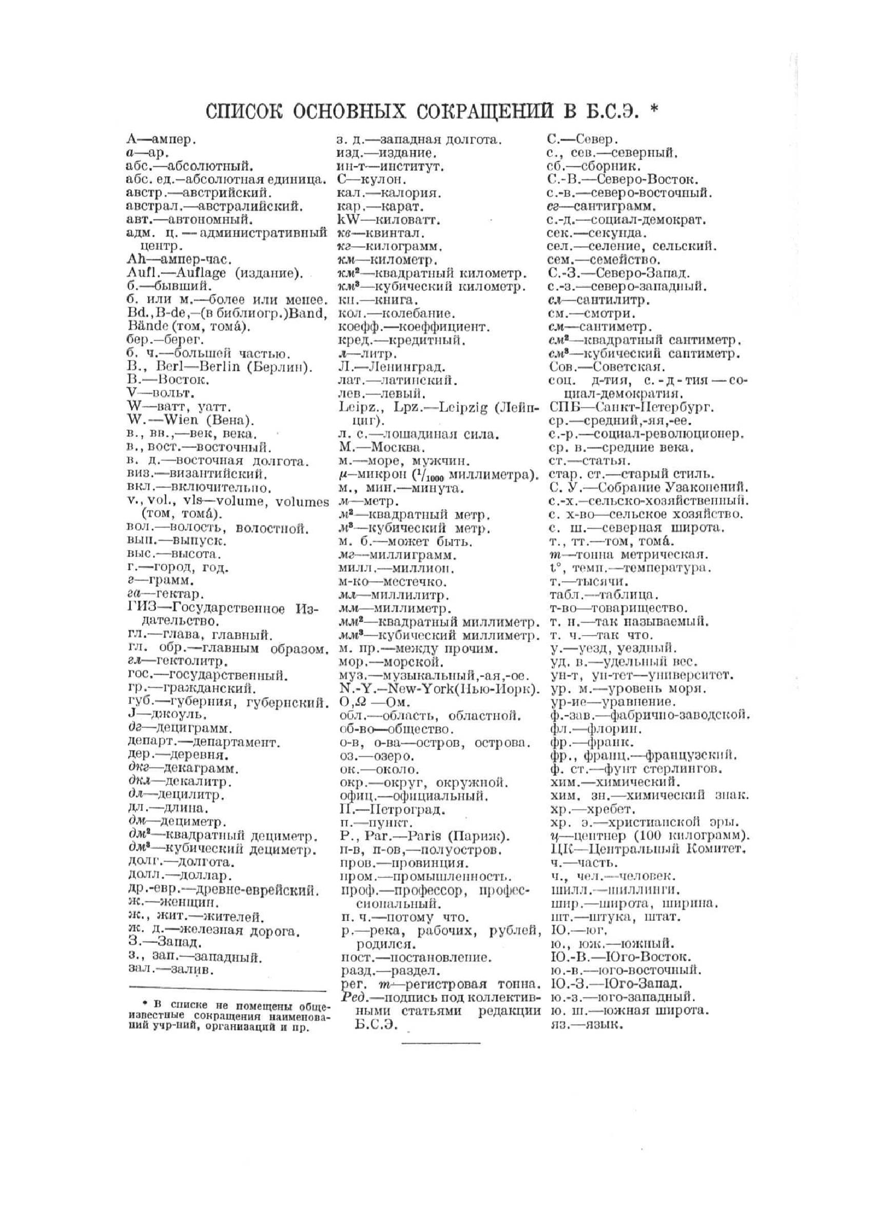 1-е издание выпущено по постановлению Президиума ЦИК СССР (1925) в 1926—47 в 66-ти томах, тиражом 50—80 тыс. экз. Содержит 65 тыс. статей, 12 тыс. иллюстраций, свыше 1 тыс. карт. Объём издания — 4,4 тыс. авторских листов текста. Тематическая структура 1-го издания БСЭ соответствовала требованиям времени — преобладали статьи, посвящённые экономике, современной политике и советской практике. "В центре внимания — СССР, строительство нашего хозяйства и нашей государственности а также международное революционное движение" (из Предисловия к 1-му тому БСЭ). Редакторами отделов и авторами крупных статей были виднейшие советские учёные и государственные деятели — А. Н. Бах, А. С. Бубнов, Н. Н. Бурденко, В. Р. Вильямс, К. Е. Ворошилов, И. М. Губкин, И. Э. Грабарь, В. В. Куйбышев, Г. М. Кржижановский, А. В. Луначарский, В. А. Обручев, М. Н. Покровский, Н. А. Семашко, В. Г. Фесенков, М. В. Фрунзе и др. Главный редактор — академик О. Ю. Шмидт (с 1924 по 1941 гг.).