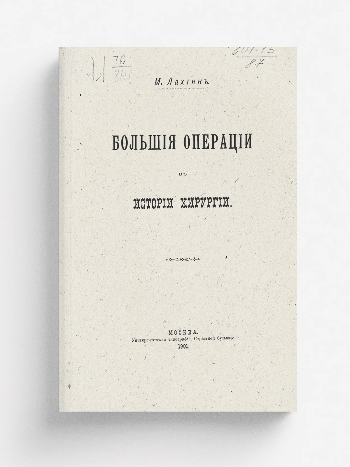 Лахтин, Михаил Юрьевич (1869–1932). Большие операции в истории хирургии. — Москва : Унив. тип., 1901. — 4, IV, 212, [2] с. : ил.; 26.