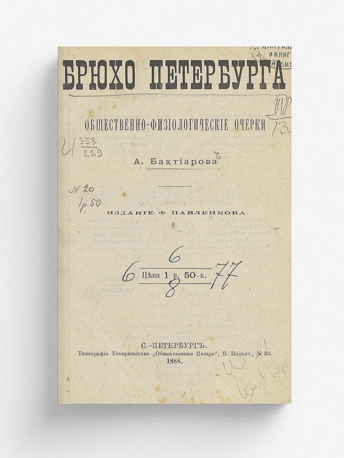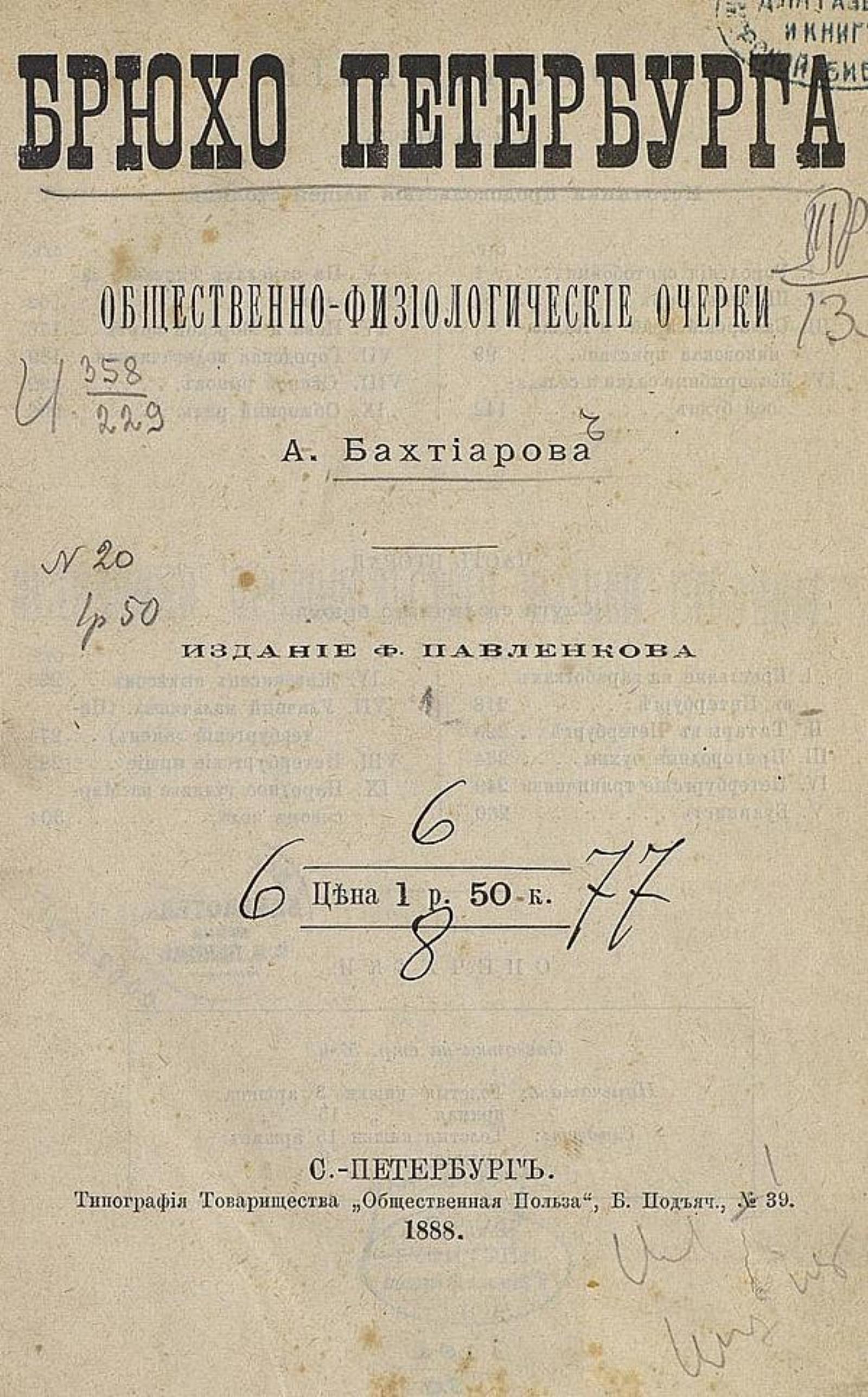 Бахтиаров, Анатолий Александрович (1851–1916). Брюхо Петербурга : Обществ.–физиол. очерки А. Бахтиарова. — Санкт–Петербург : Ф. Павленков, 1888. — [4], 316 с.; 21.