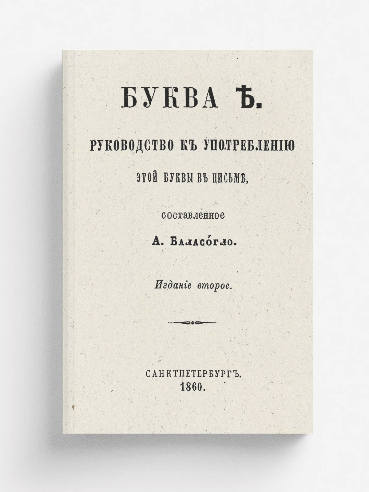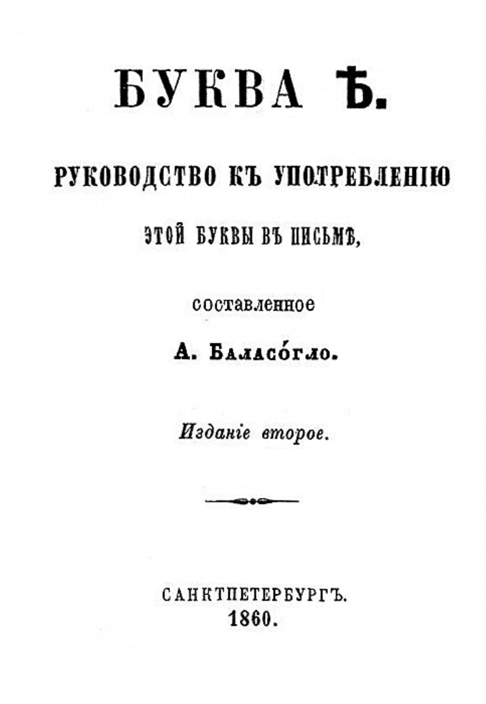 Баласогло, Александр Пантелеймонович (1813–1893). Буква ? : Руководство к употреблению этой буквы в письме, сост. А. Баласогло. — 2-е изд. — Санкт-Петербург : тип. П. А. Кулиша, 1860. — 144 с.; 14.