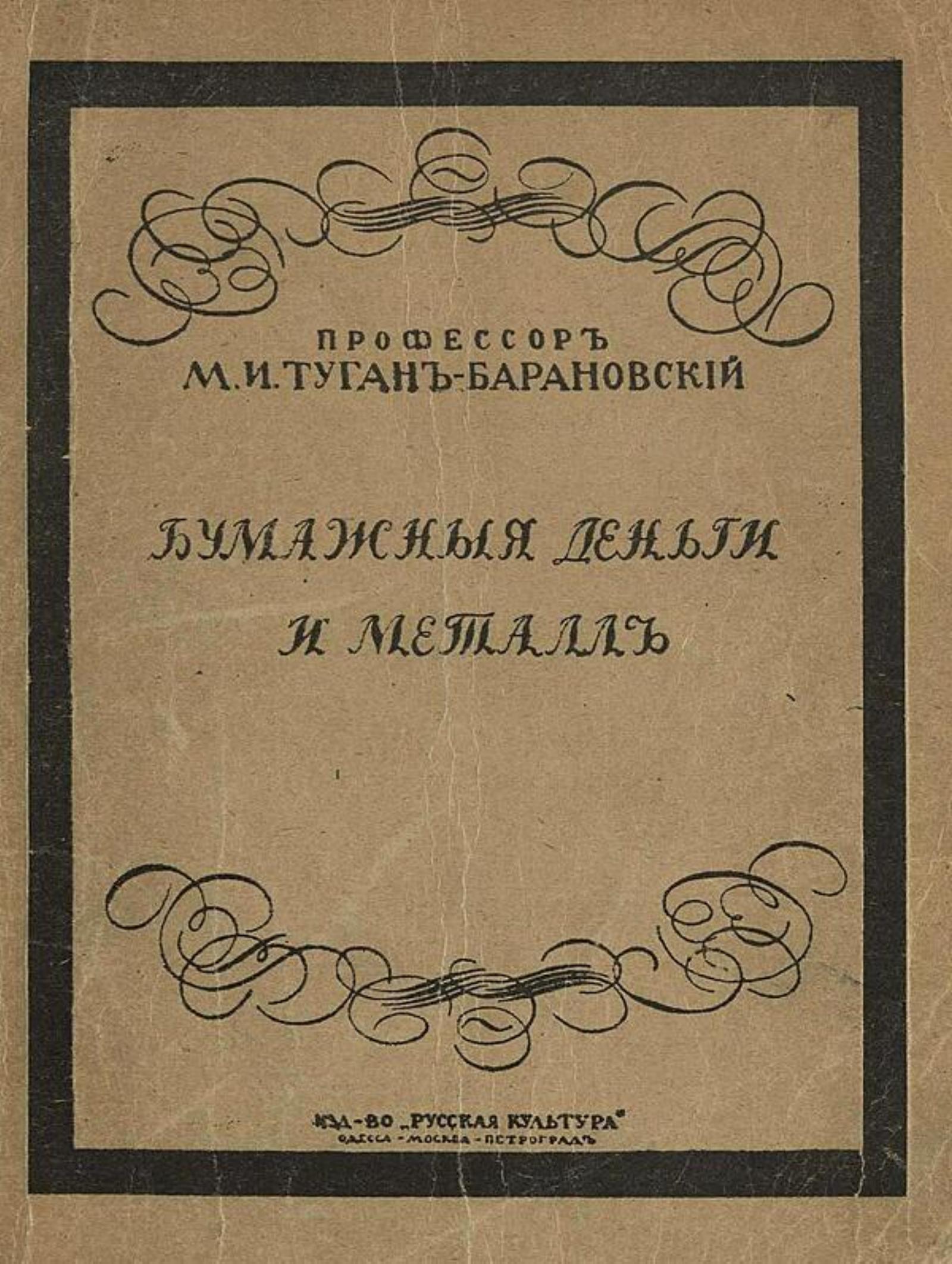 Туган-Барановский, Михаил Иванович (1865–1919). Бумажные деньги и металл / Проф. М. И. Туган-Барановский. — Посмертное изд. с изм. и доп. автора. — Одесса: Русская культура, 1919. — 132 с.; 22 см.
