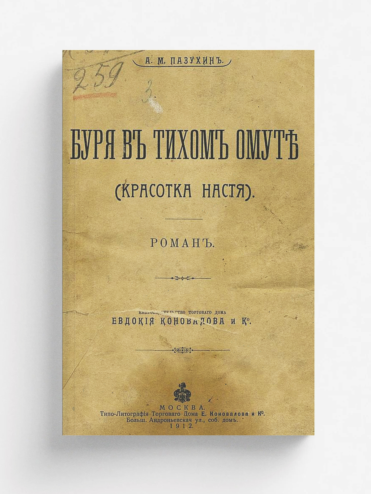 Пазухин, Алексей Михайлович (1851–1919). Буря в тихом омуте. (Красотка Настя) : Роман / А. М. Пазухин. — 2-е изд. — Москва : торг. дом Е. Коновалова и К°, 1912. — 240 с.; 22.