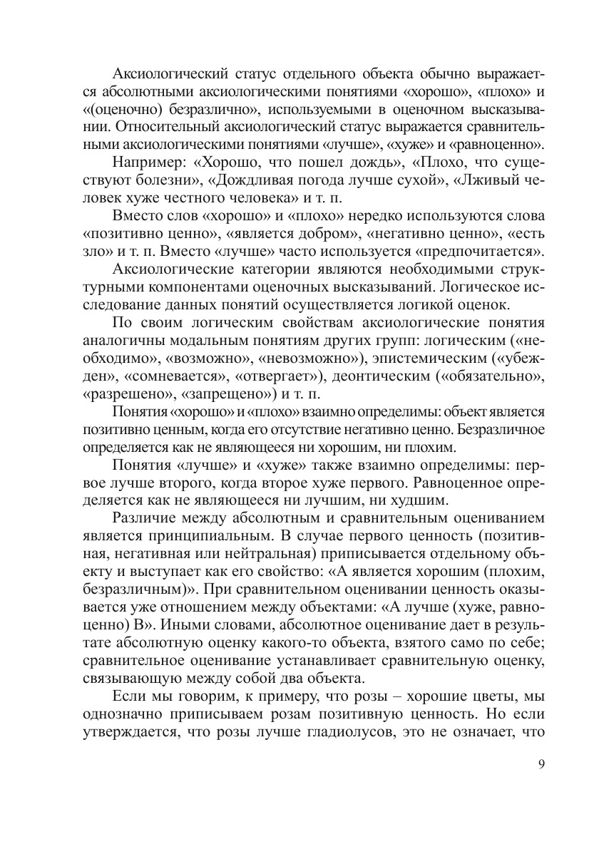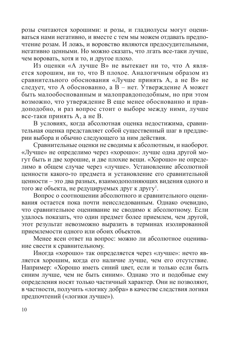 В монографии рассматриваются предпочтения (сравнительные оценки), выражаемые обычно с помощью терминов «лучше», «хуже», «равноценно». Затрагиваются три темы: роль предпочтений в человеческой деятельности, логический анализ предпочтений и система предпочтений, предполагаемых научным методом. Строятся новые логические теории предпочтений, в частности, логики предпочтений, не являющихся транзитивными.