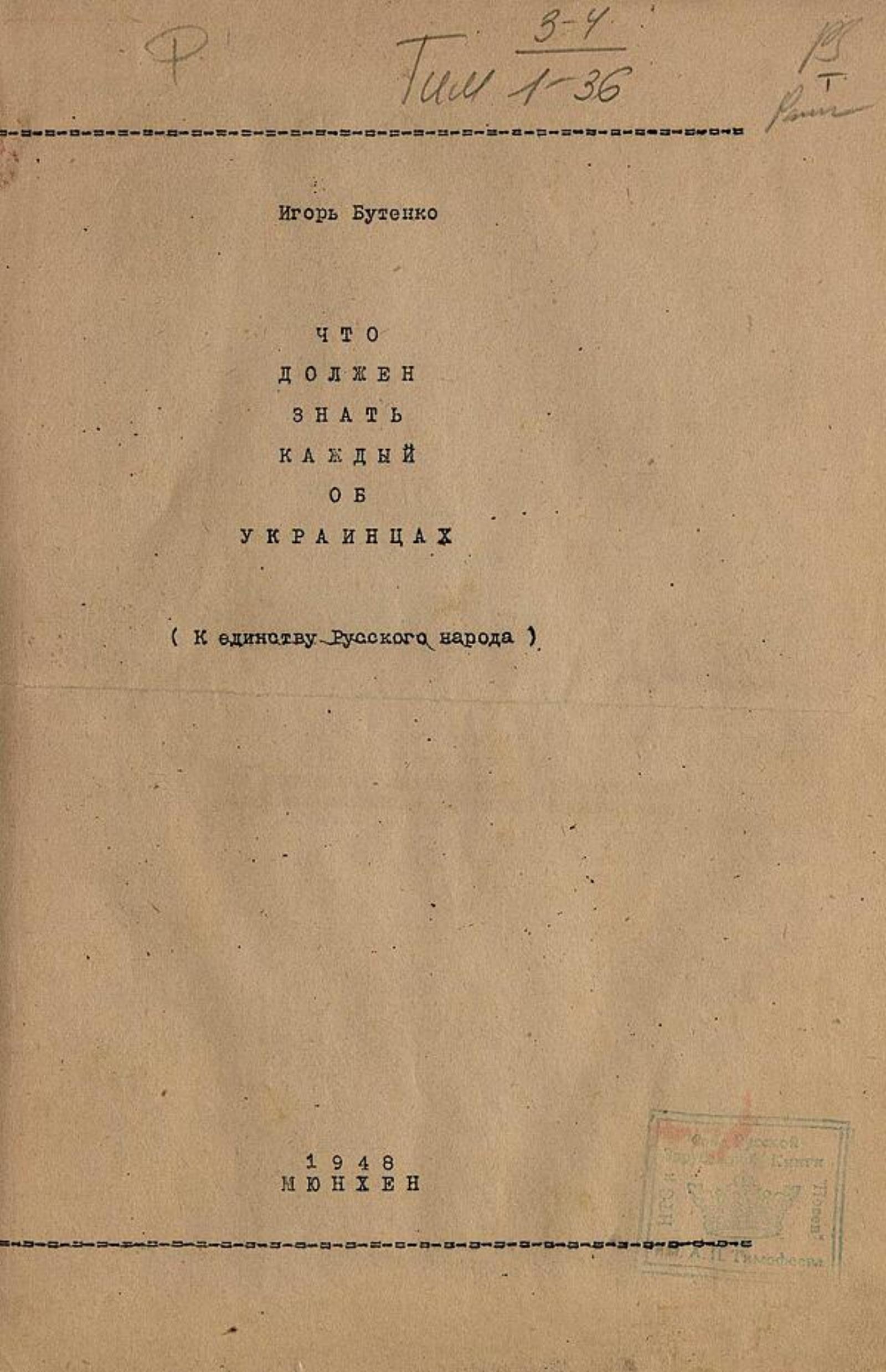 Бутенко, Игорь. Что должен знать каждый об украинцах (К единству Русского народа) / Игорь Бутенко. — Мюнхен, 1948. — 21 с.; 30 см.
