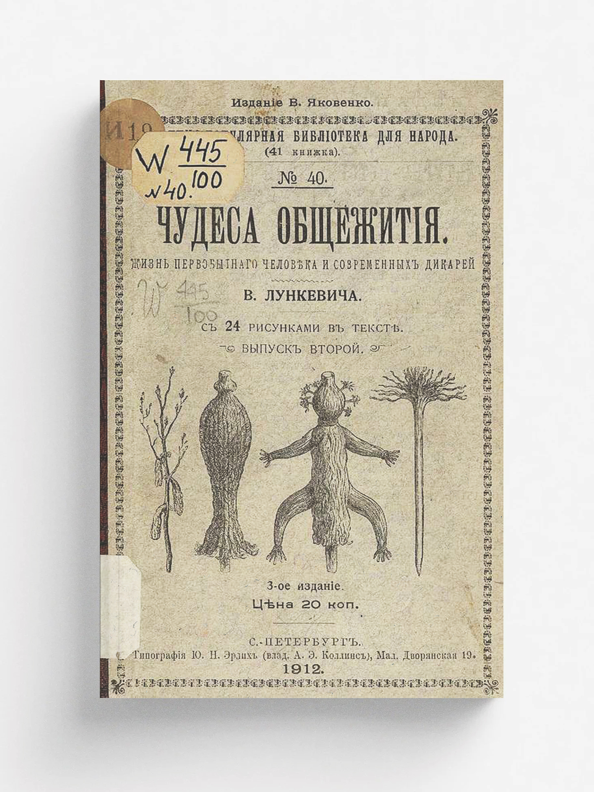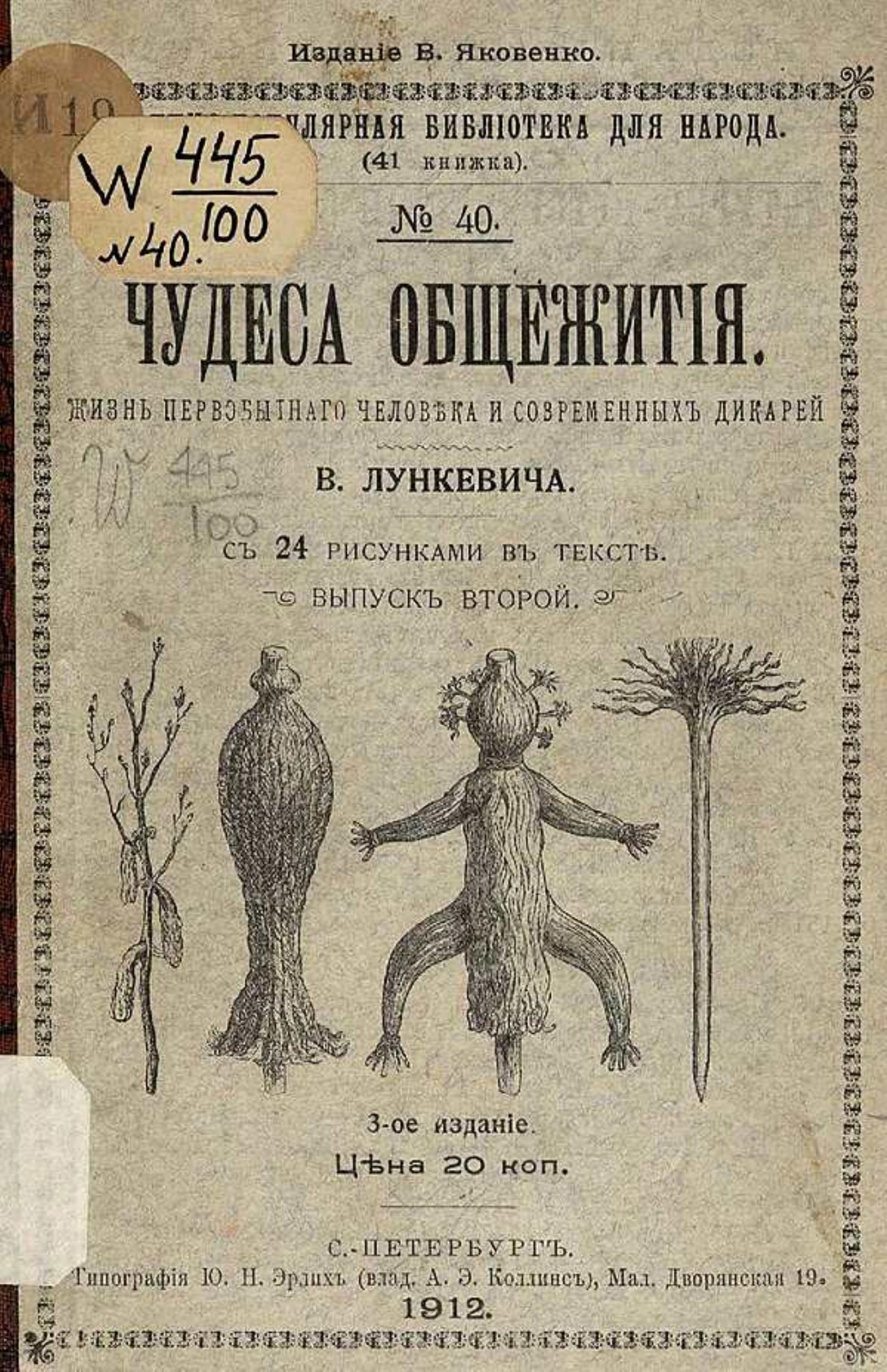 Лункевич, Валериан Викторович (1866–1941). Чудеса общежития : Жизнь первобыт. человека и соврем. дикарей / [Соч.] В. Лункевича. — 3-е изд. Вып. 1-[2]. — Санкт-Петербург : В. Яковенко, 1912-1913 (обл. 1912). — 2 т. : ил.; 19. — (Научно-популярная библиотека для народа / [Соч.] В. Лункевича; (41 кн.). № 39-40).