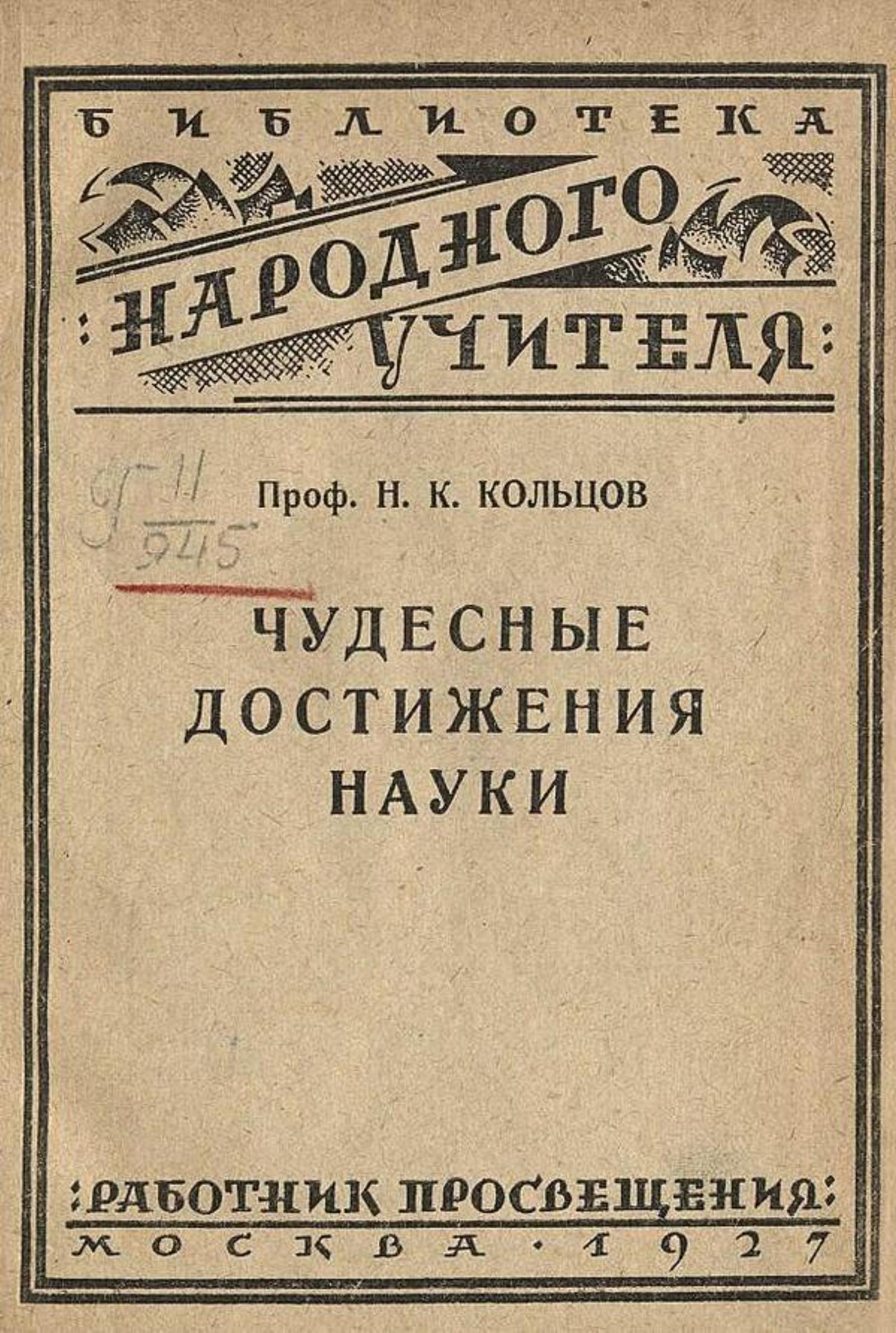 Кольцов, Николай Константинович (1872–1940). Чудесные достижения науки [Текст] / Проф. Н. К. Кольцов. — Москва : Работник просвещения, 1927 (тип. Госиздата «Красный пролетарий»). — 156 с.; 18?13 см. + [3] с. объявл. — (Библиотека народного учителя).