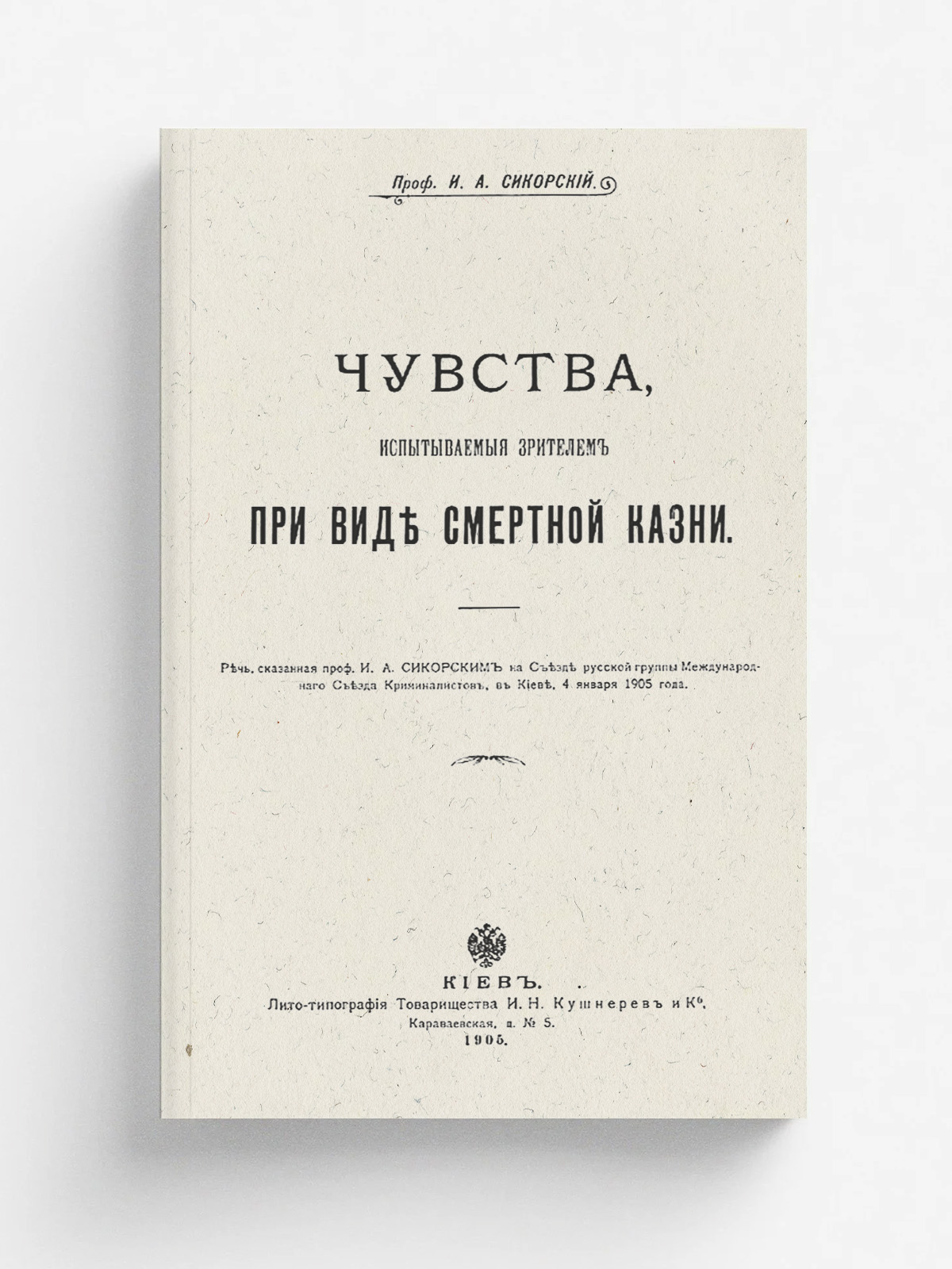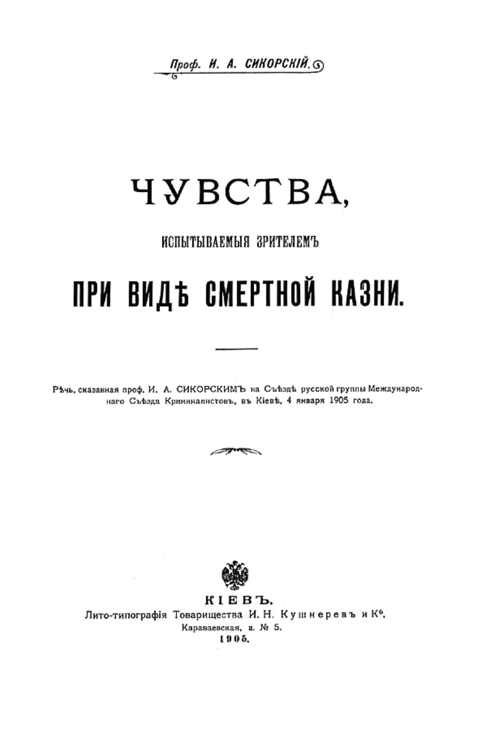 Сикорский, Иван Алексеевич (1842–1919). Чувства, испытываемые зрителем при виде смертной казни : Речь, сказ. проф. И.А. Сикорским на Съезде Рус. группы Междунар. съезда[!] криминалистов, в Киеве, 4 янв. 1905 г. — Киев : лито-тип. т-ва И. Н. Кушнерев и К°, 1905. — 10 с.; 25.