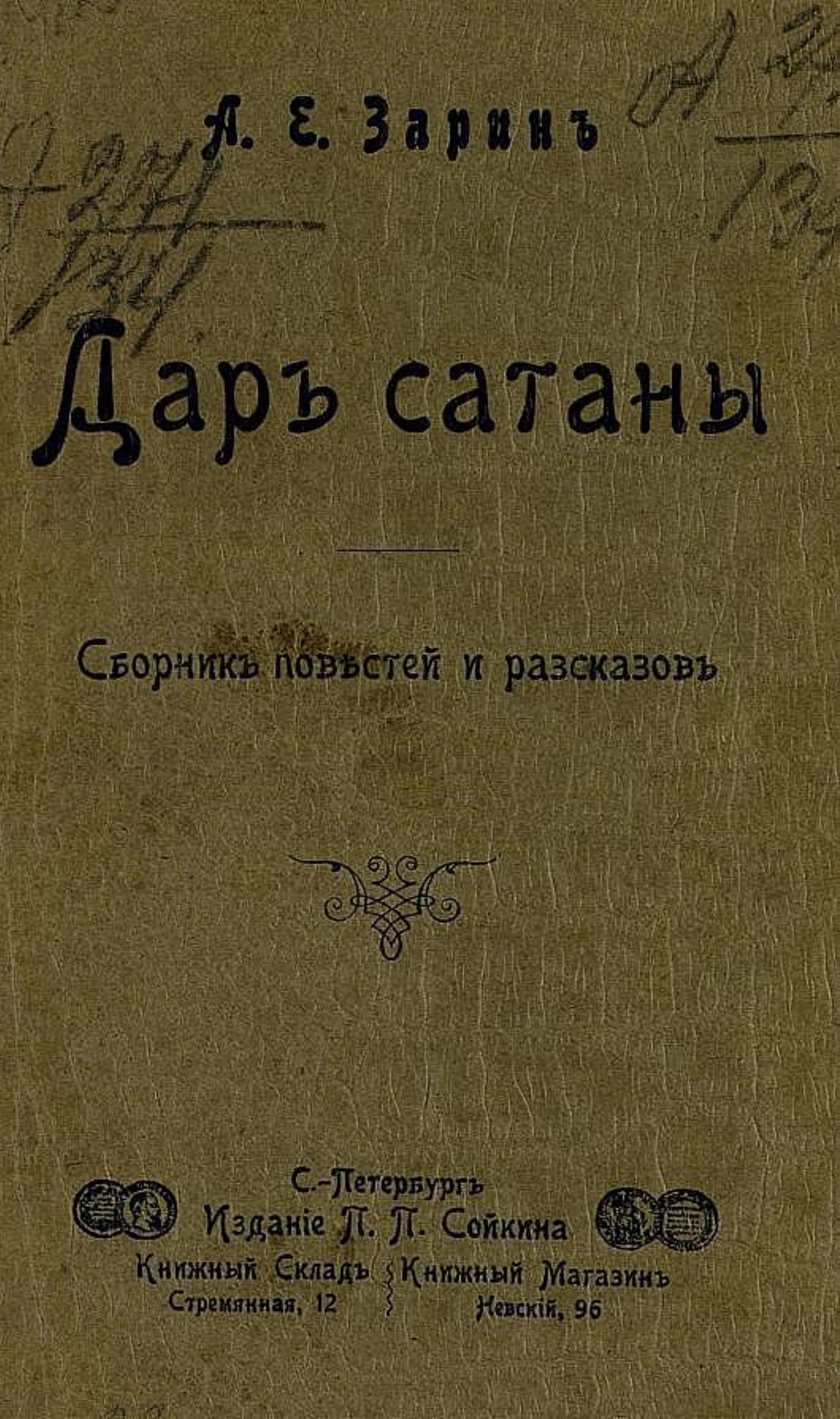 Зарин, Андрей Ефимович (1862–1929). Дар сатаны: Сб. повестей и рассказов / А. Зарин. — Санкт-Петербург: П. П. Сойкин, ценз. 1904. — 291, [2] с.; 19.