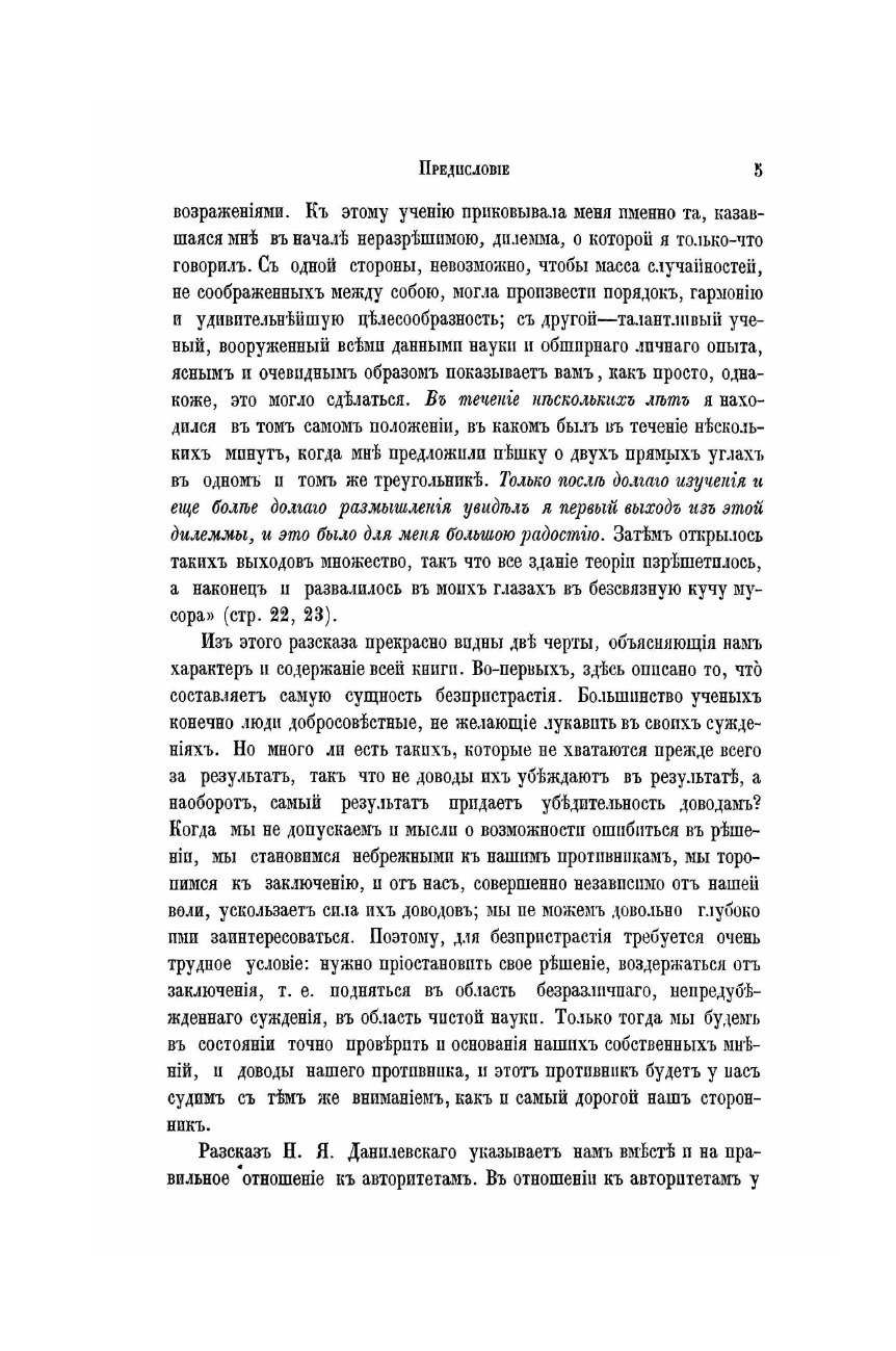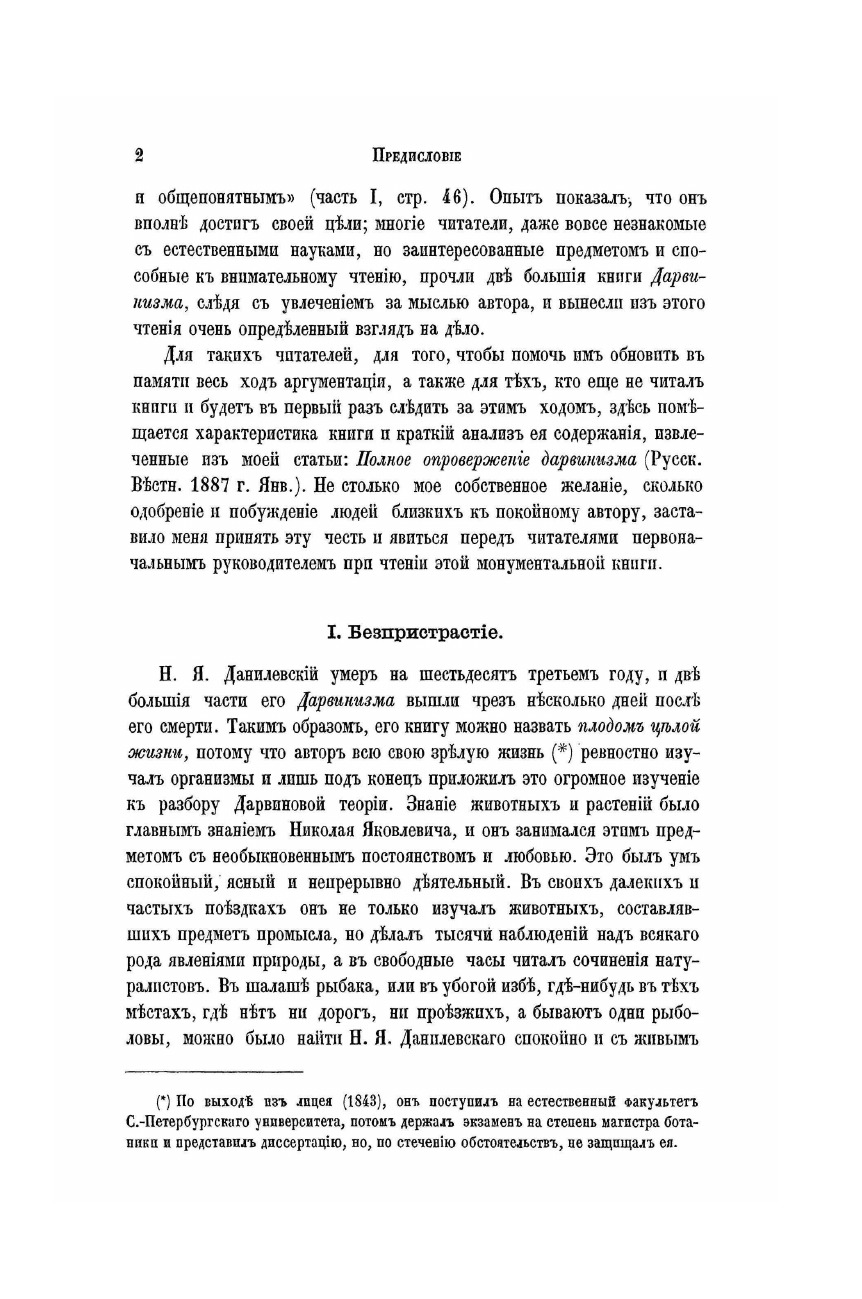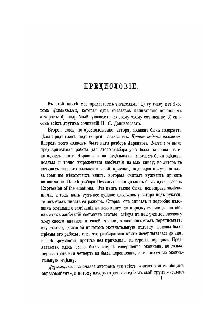 Публицист, социолог, идеолог панславизма в своем трехтомном труде "Дарвинизм. Критическое исследование" (1885 г.) Н.Я. Данилевский собрал воедино возражения, высказанные против дарвинизма за четверть века его существования, и изложил собственные взгляды на эволюцию органических форм. Горячий сторонник идей Данилевского, знаменитый философ-почвенник Н.Н. Страхов писал: "Об этой книге нужно кричать на площадях и проповедовать с крыш. Это явление необыкновенное, далеко выходящее из ряда, один из подвигов русского умаПеред нами не только полное, но и всестороннее и окончательное опровержение дарвинизма. Тому, кто со вниманием прочтет книгу Н. Я. Данилевского, будет совершенно ясно, что собственно дарвинизм не содержит в себе ни зерна истины, не имеет никакой состоятельности. Многим это будет ужасно странно слышать, между тем тут не может быть никакого сомнения."