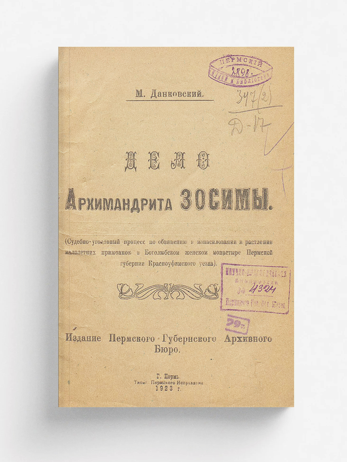 Данковский, М. Дело архимандрита Зосимы (Судебно-уголовный процесс по обвинению в изнасиловании и растлении малолетних приютянок в Боголюбском женском монастыре Пермской губ. Красноуфимского уезда) / М. Данковский ; Предисл.: М. Туркин. — Пермь : Пермское губернское архивное бюро, 1923. — [4], II, 92, [2] с., [4] л. ил., портр.; 21 см.