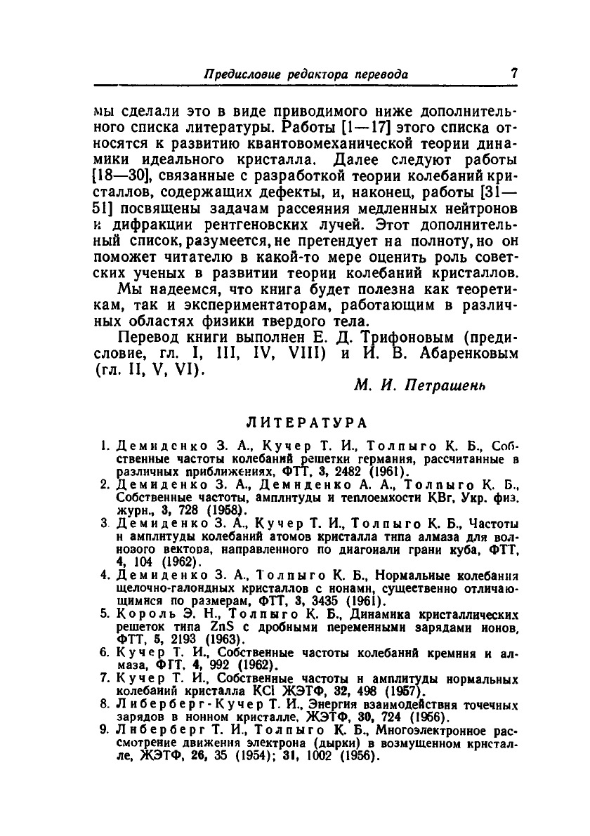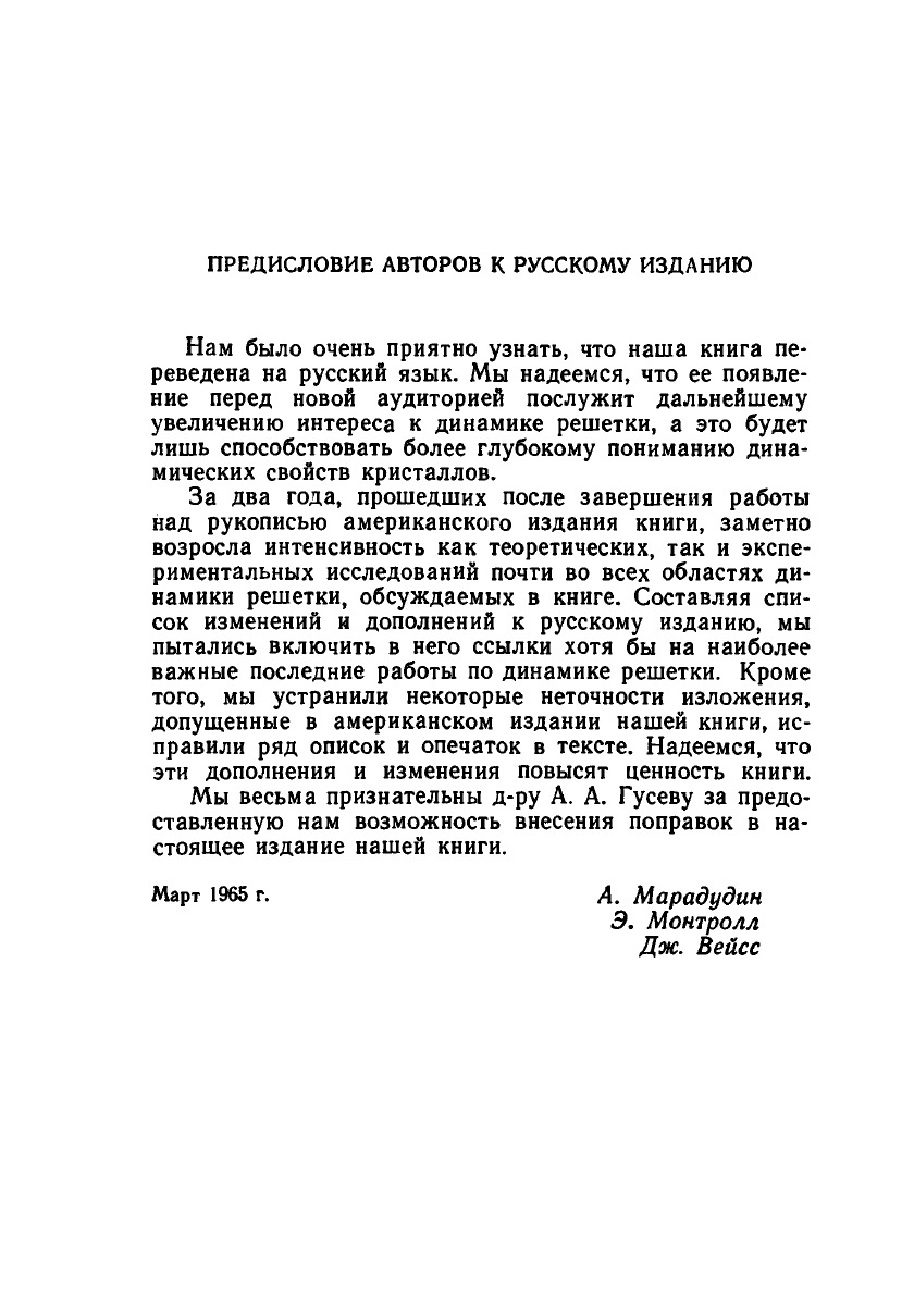 Предлагаемая вниманию читателей книга, написанная тремя крупными американскими специалистами в области теоретической физики твердого тела, содержит систематическое изложение современного состояния и достижений теории кристаллической решетки, знакомство с которыми необходимо любому специалисту в области кристаллофизики, физики полупроводников и диэлектриков, металлов и сплавов, магнитных материалов и т. п. В книге рассмотрены определение и свойства спектра упругих колебаний решетки, способы вычисления термодинамических функций, роль различных дефектов и способы их учета, роль поверхности и поверхностных колебаний и, наконец, методы определения энергетического спектра по данным о рассеянии рентгеновских лучей и нейтронов. Книга рассчитана на научных работников, как теоретиков, так и экспериментаторов, занимающихся различными вопросами физики твердого тела, а также будет полезна преподавателям и аспирантам физических и физико-технических факультетов.