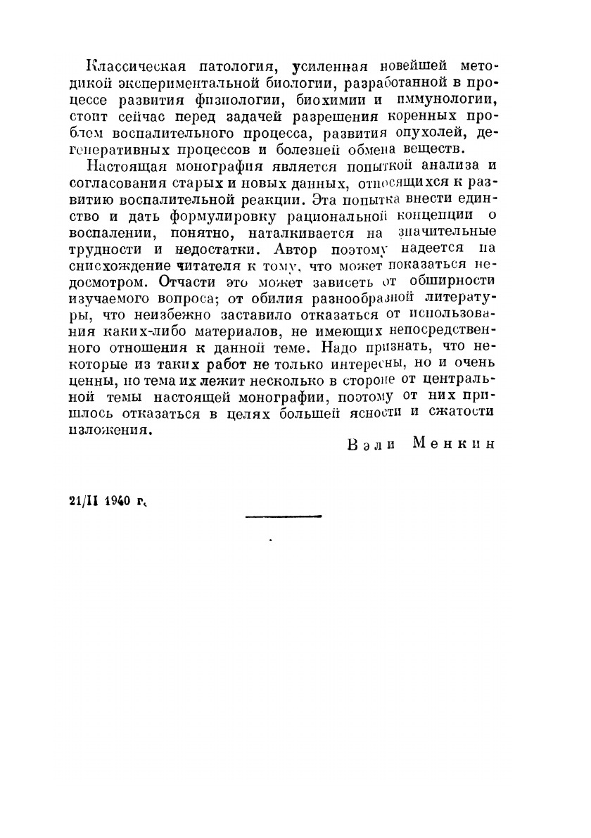 С иллюстрациями. Книга представляет собой сводку многочисленных исследований автора. Вопрос о воспалении является одним из кардинальных вопросов медицины, всегда интересовавшим врачей. Можно без преувеличения сказать, что история вопроса о воспалении, поскольку в ней нашли отражение воззрения всех крупных медицинских школ, есть в известной мере история развития медицины вообще. Плодотворность результатов работы В.Менкина именно и заключается в его обширном экспериментальном материале, представляющем интерес и для клиницистов, и для патологов.