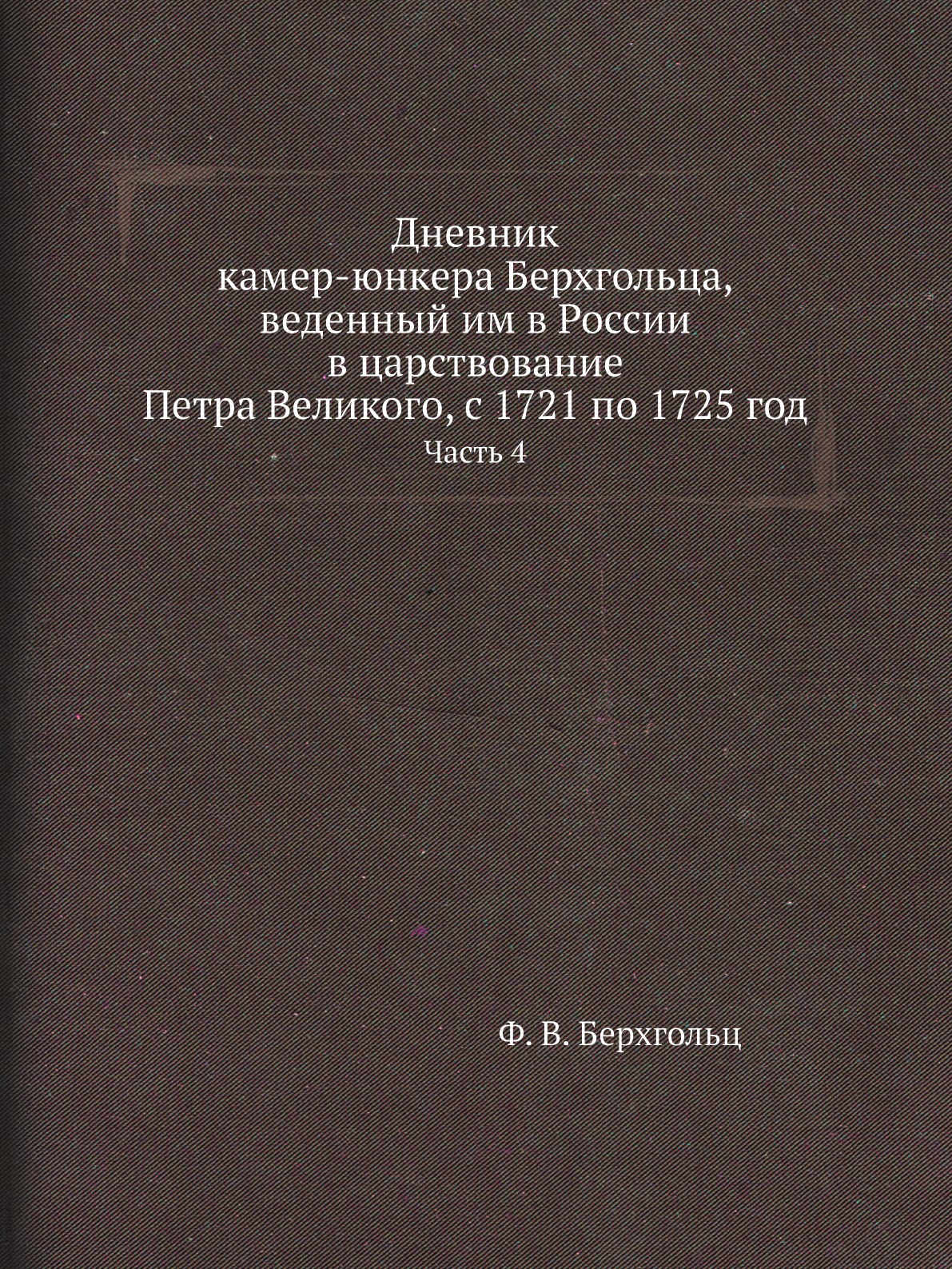 Печатная книга «Дневник камер-юнкера Берхгольца, веденный им в России в царствование Петра Великого, с 1721 по 1725 год, Часть 4» в мягкой обложке, язык - русский. В книге 242 страниц, она напечатана на белой офсетной бумаге плотностью 80 г/м². Формат издания — 205x280 мм. Все книги аккуратно упаковываем в прочный трёхслойный непрозрачный картонный конверт.