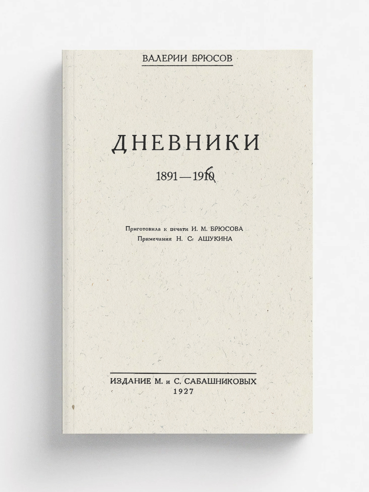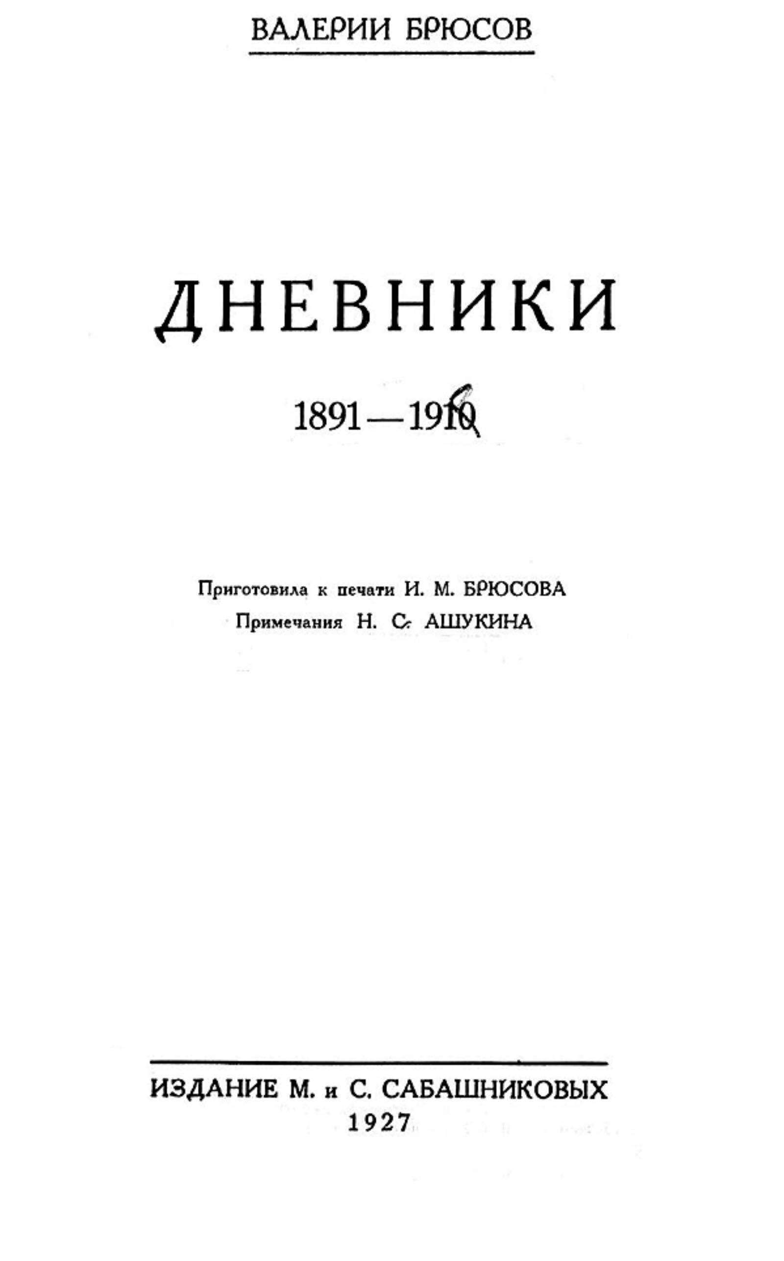 Брюсов, Валерий Яковлевич (1873–1924). Дневники 1891–1910 / Валерий Брюсов ; подготовила к печати И. М. Брюсова ; примеч. Н. С. Ашукина ; [обл.: А. Кравченко]. — [Москва] : М. и С. Сабашниковы, 1927. — [8], 203 с.; 23 см. — (Записи прошлого. Воспоминания и письма / под ред. С. В. Бахрушина и М. А. Цявловского).