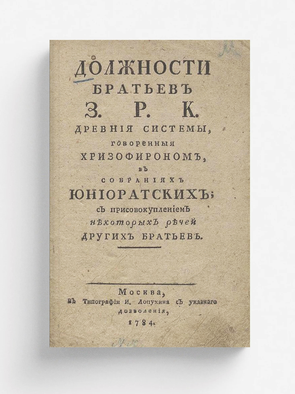 Герунг, Йозеф Фридрих (1733–?). Должности братьев З[лато] Р[озового] К[реста] древния системы / Говоренныя Хризофироном в собраниях юниоратских ; С присовокуплением некоторых речей других братьев. — Москва : в типографии И. Лопухина, 1784. — 208 с.; 8° (18 см).
