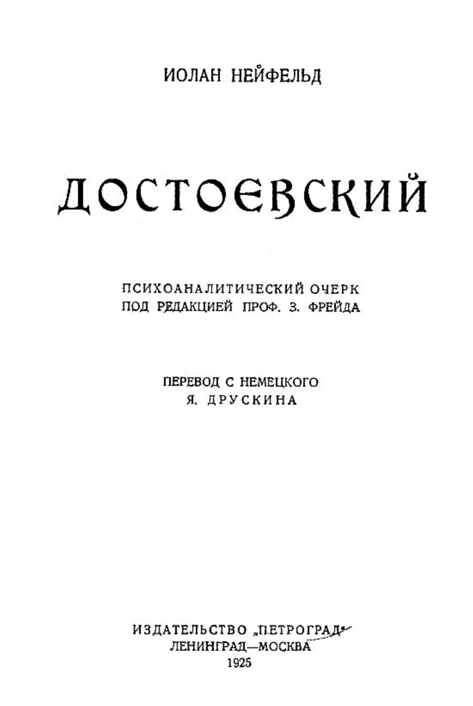 Нейфельд, Иолан. Достоевский : психоаналитический очерк под ред. проф. З. Фрейда / Иолан Нейфельд ; [предисл.: П. Губер] ; пер. с нем. Я. Друскина. — Ленинград ; Москва : Петроград, 1925. — 96 с.; 20 см.