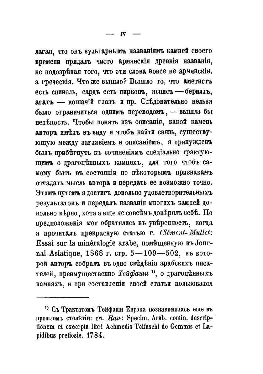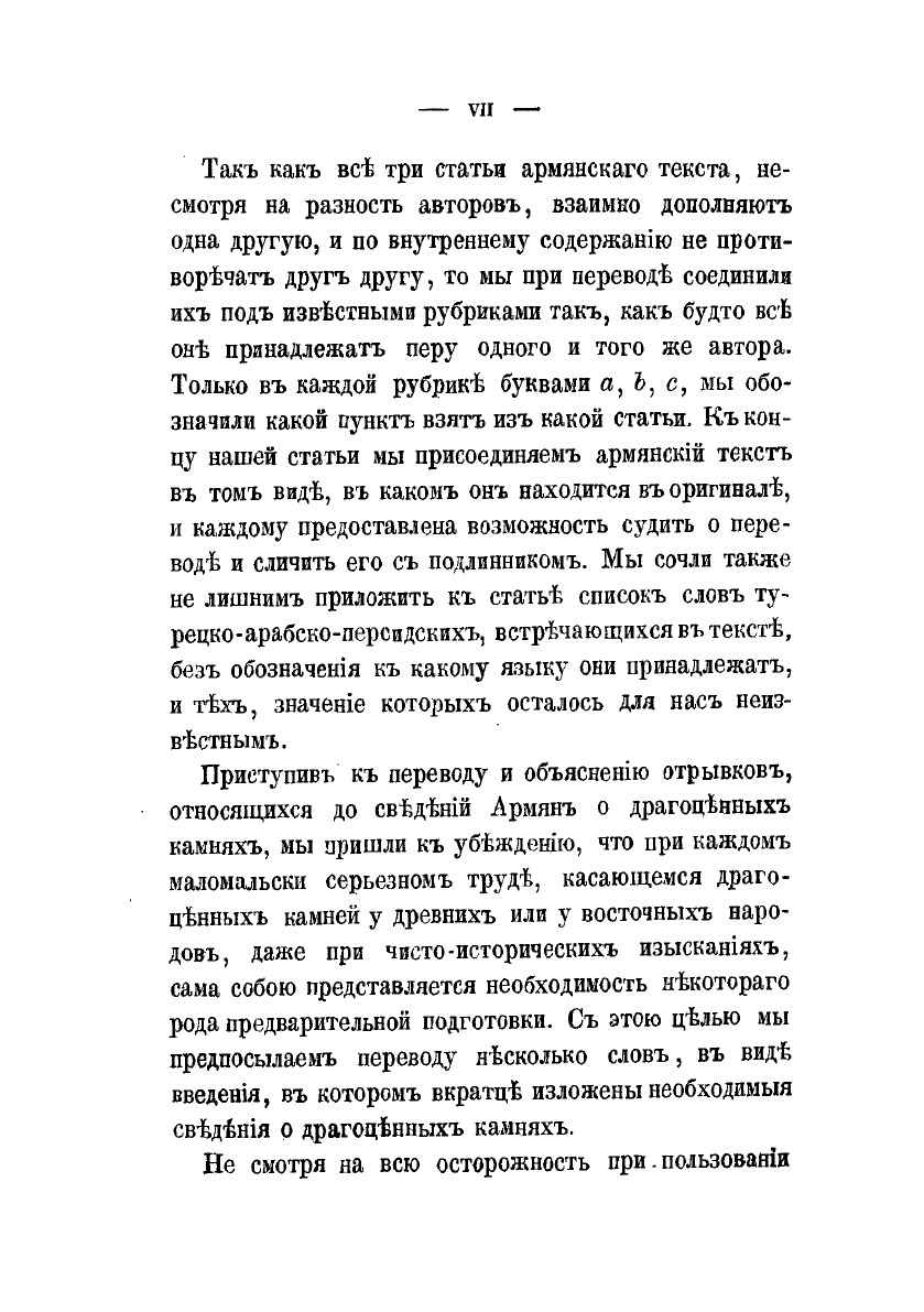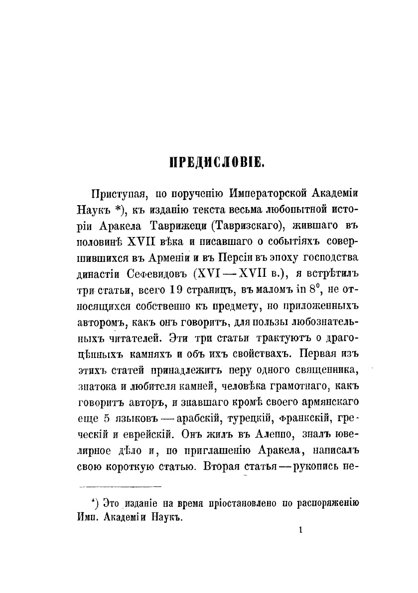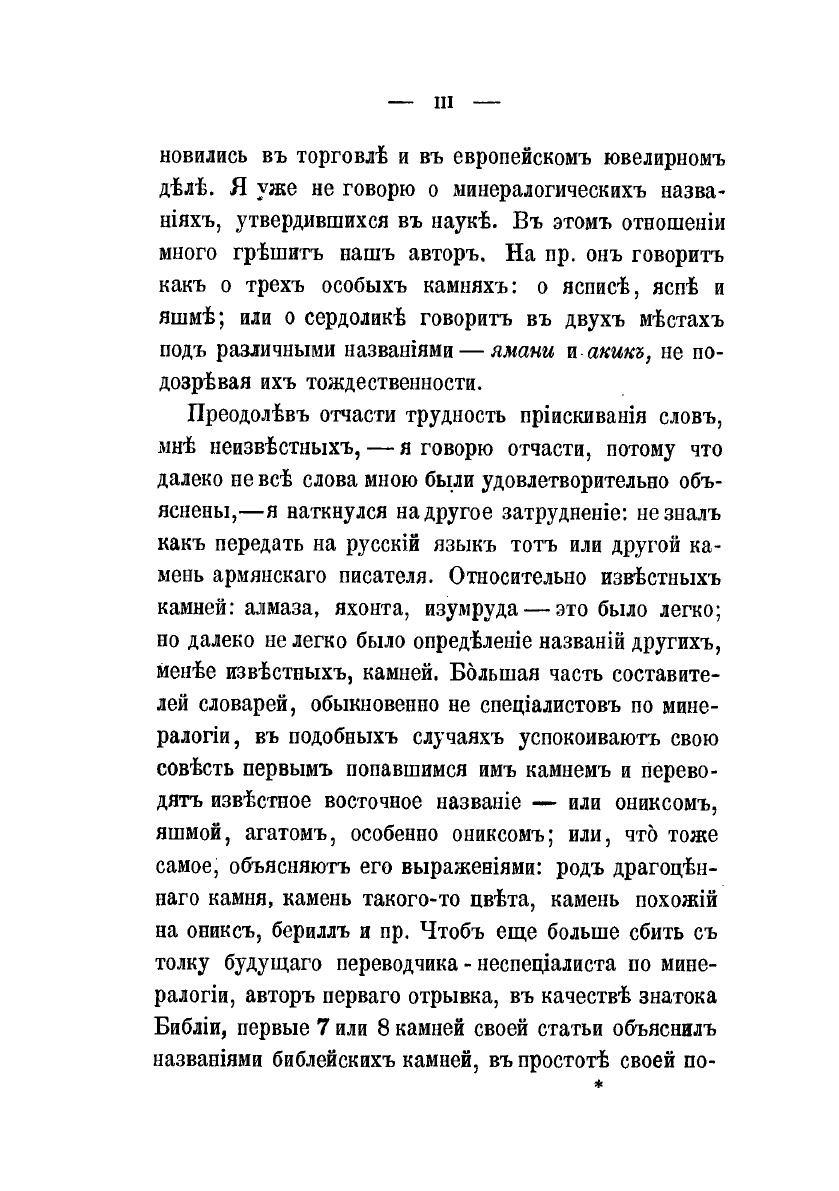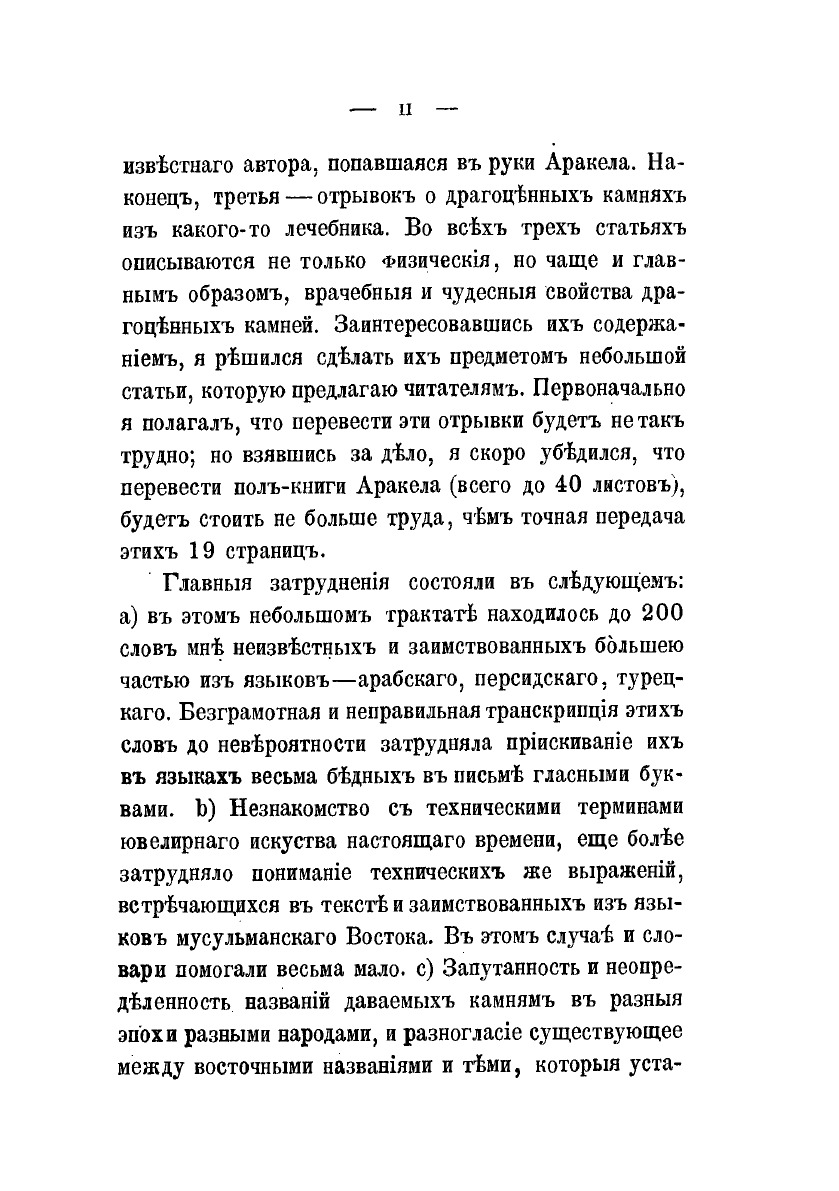 В данной книге представлены три статьи в которых трактуются сведения о драгоценных камнях и об их свойствах. Первая из этих статей принадлежит перу одного священника, знатока и любителя камней, человека грамотного, как говорит автор, и знавшего кроме своего армянского еще 5 языков — арабский, турецкий, франкский, греческий и еврейский. Он жил в Алеппо, знал ювелирное дело и, по приглашению Аракела, написал свою короткую статью. Вторая статья — рукопись неизвестного автора, попавшаяся в руки Аракела. На-конец, третья — отрывок о драгоценных камнях из какого-то лечебника. Во всех трех статьях описываются не только физические, но чаще и главным образом, врачебные и чудесные свойства драгоценных камней. Заинтересовавшись их содержанием, я решился сделать их предметом небольшой статьи, которую предлагаю читателям.